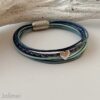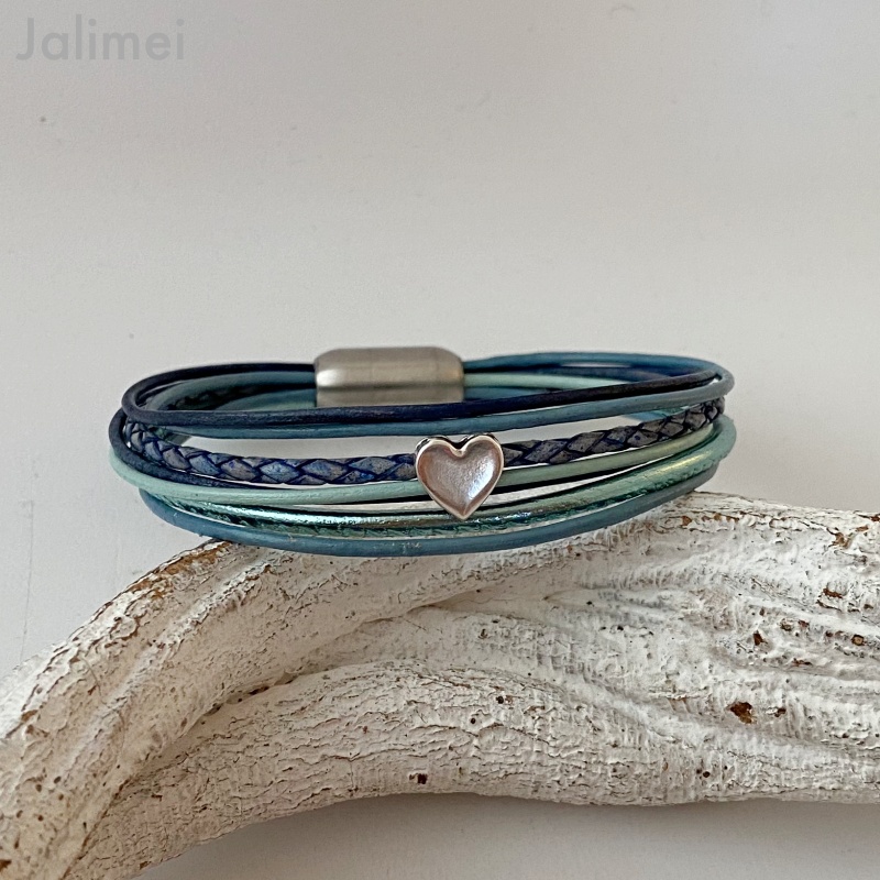 Schönes Armband aus Lederbändern in den Farben blau und mintgrün. Verwendet sind 1,5 mm starke Lederbänder sowie ein Nappa- und ein geflochtenes Lederband. Aufgepeppt ist das Armband mit einem kleinen Metallschieber Herz, das einige Bänder zusammenfasst. Es wird mit einem hochwertigen Edelstahlmagnetverschluß geschlossen.