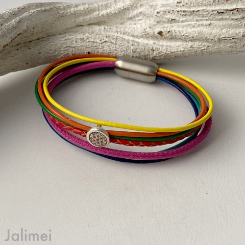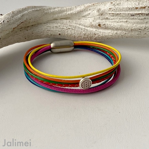 Das fröhliche Lederarmband Lebensblume bunt von Jalimei ist ein echtes GuteLauneArmband! Durch die bunten Farben passt es zu fast jedem Outfit und ist ein echter Hingucker. Das Zeichen der Lebensblume ist ein Symbol für Schutz und Harmonie, löst Blockaden und lässt die Lebensenergie wieder fließen.