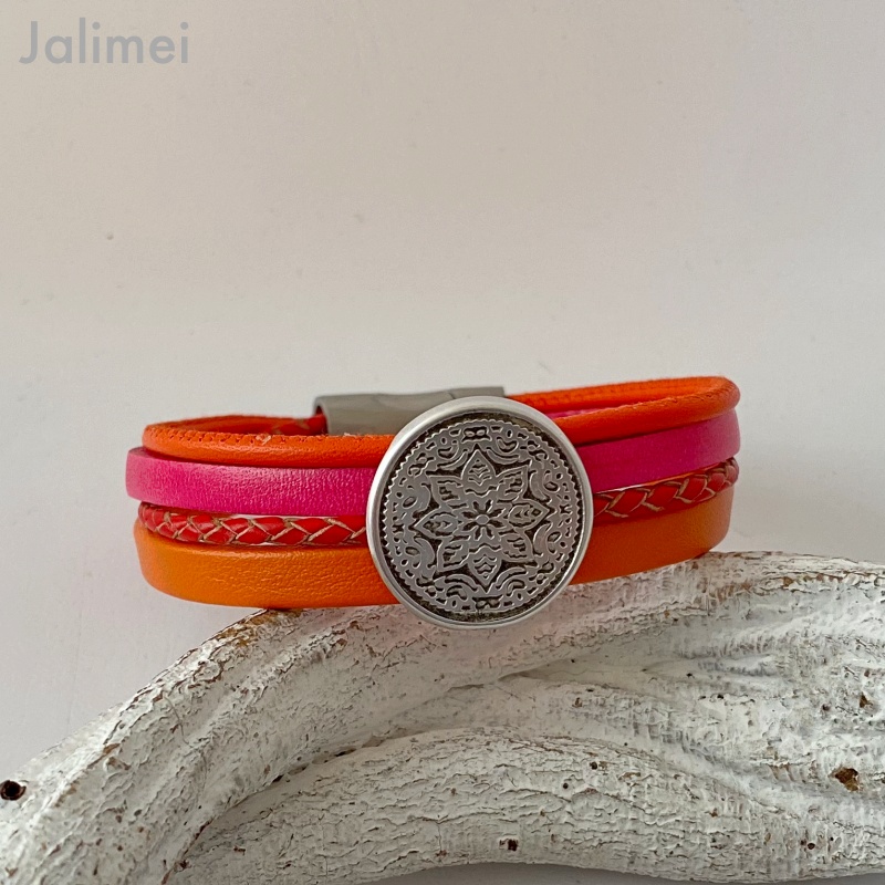 Das schönes Lederarmband mit Mandala orange pink besticht durch seine kräftigen Farben. Es ist aus 4 verschiedenen echten Lederbändern in den Farben orange, rot und pink gefertigt. Aufgepeppt ist es mit einem schönen Metallschieber Mandala (Durchmesser ca. 23 mm) und wird mit einem hochwertigen Edelstahl-Magnetverschluß geschlossen.