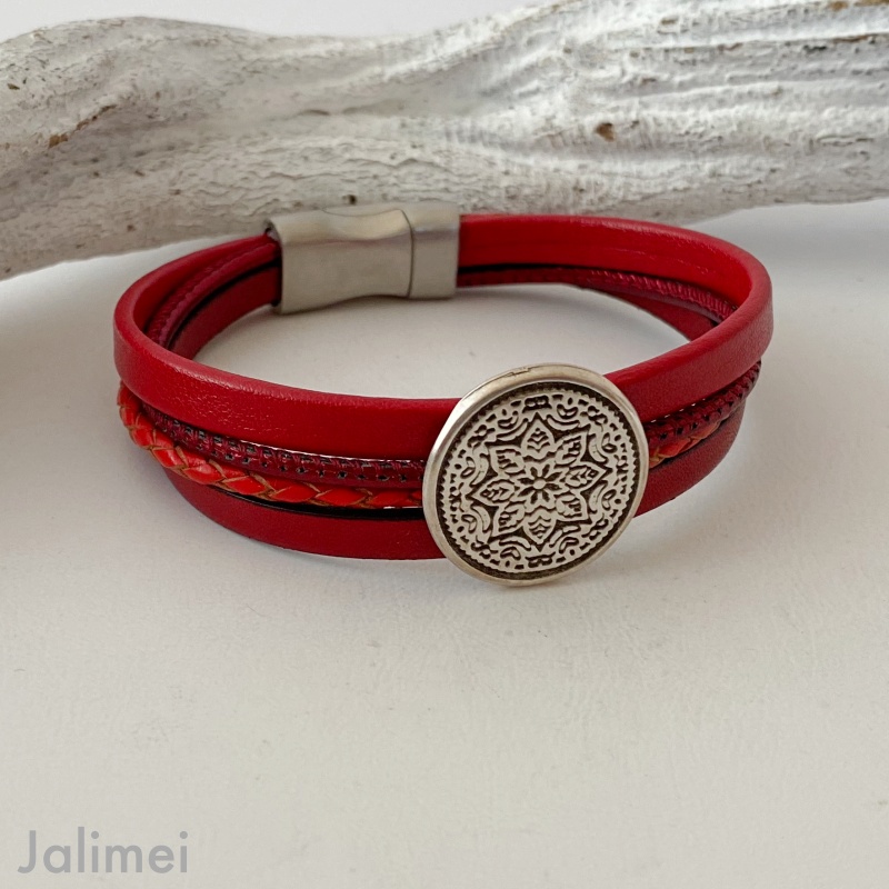 Mein knalliges Lederarmband Mandala rot habe ich aus 4 verschiedenen echten Lederbändern in unterschiedlichen Rottönen gefertigt. Aufgepeppt ist es mit einem schönen Metallschieber Mandala (Durchmesser ca. 23 mm). Durch das knallige Rot ist die Kette prima zu sehr vielen Outfits kombinierbar. Durch den hochwertigen Edelstahl-Mangetverschluß lässt es sich leicht an- und ablegen.