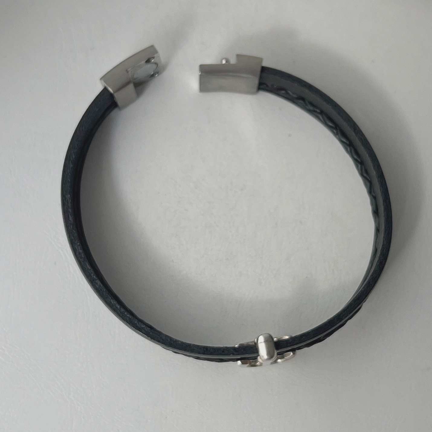 Das Schmuckstück besteht aus 3 schwarzen Lederbändern: ein ca. 5 mm breites flaches Lederband, ein geflochtenes Lederband (ca. 2,5 mm) und ein Nappalederband (ca. 2,5 mm). Die drei Bänder werden mit dem Anker zusammengehalten.