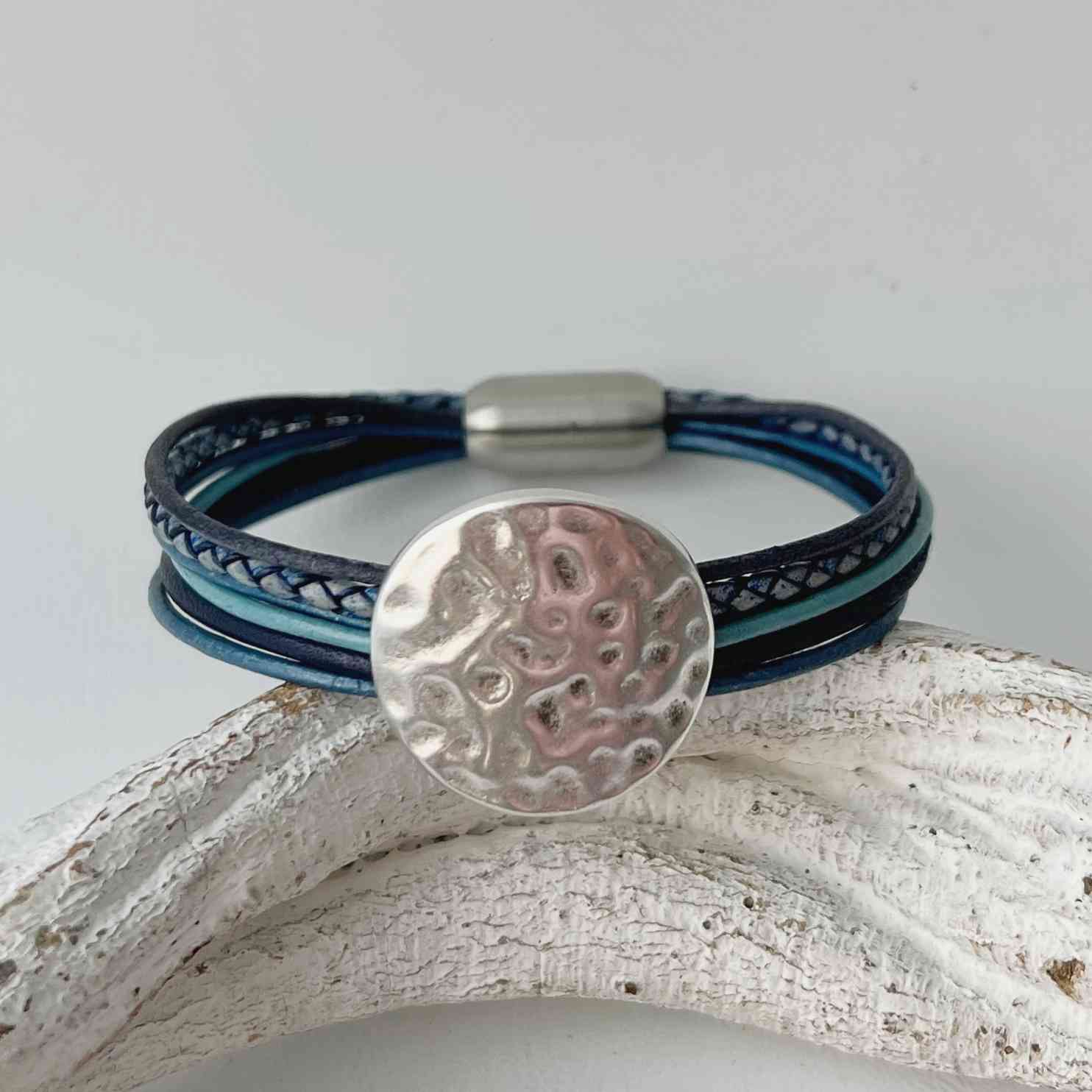 Verarbeitet sind ein geflochtenes Lederband (ca. 2,5 mm) in antikblau, ein dunkelblaues Nappalederband (ca. 2,5 mm) und 4 farblich darauf abgestimmte Lederbändchen (je ca. 1,5 mm). Die gehämmerte Scheibe (ca. 26 mm) hält die Bänder zusammen.