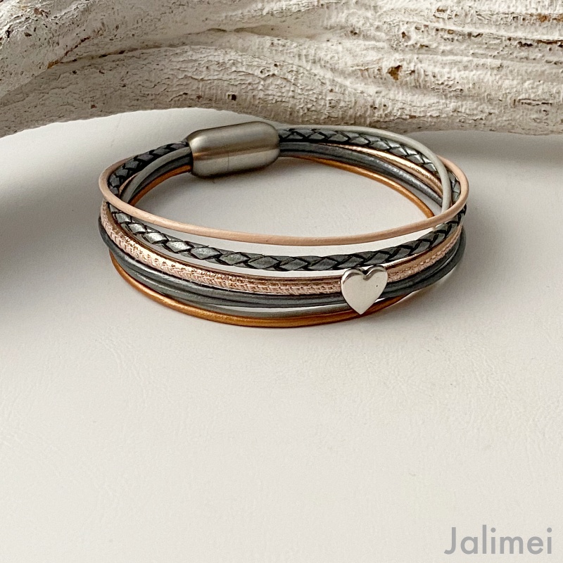 Verarbeitet ist ein geflochtenes Lederband (ca. 2,5 mm) in stahlgrau, ein gesäumtes Nappalederband (ca. 2,5 mm) in rosegold sowie 5 farblich dazu abgestimmte Lederbänder mit einer Stärke von ca. 1,5 mm. Aufgepeppt ist das Armband mit einem kleinen Metallschieber Herz (ca. 8 mm), das einige Bänder zusammenfasst.
