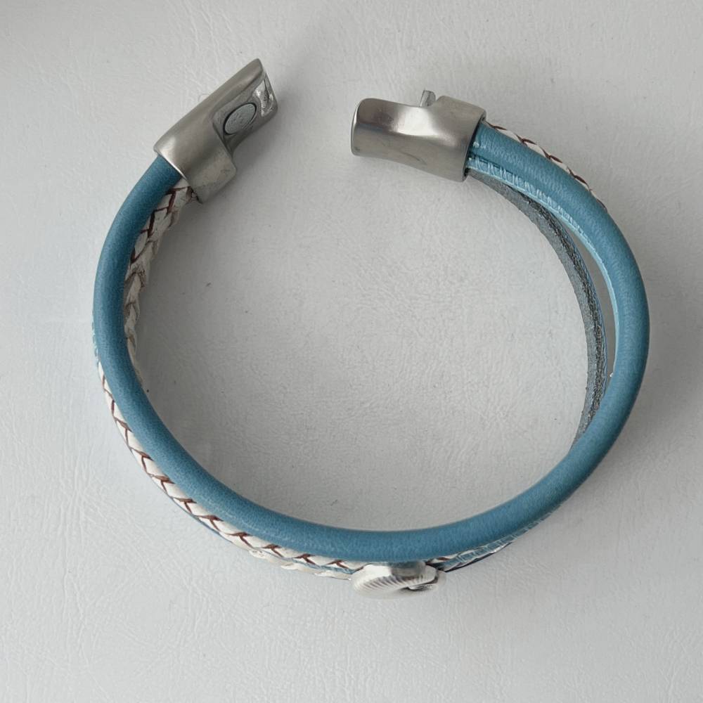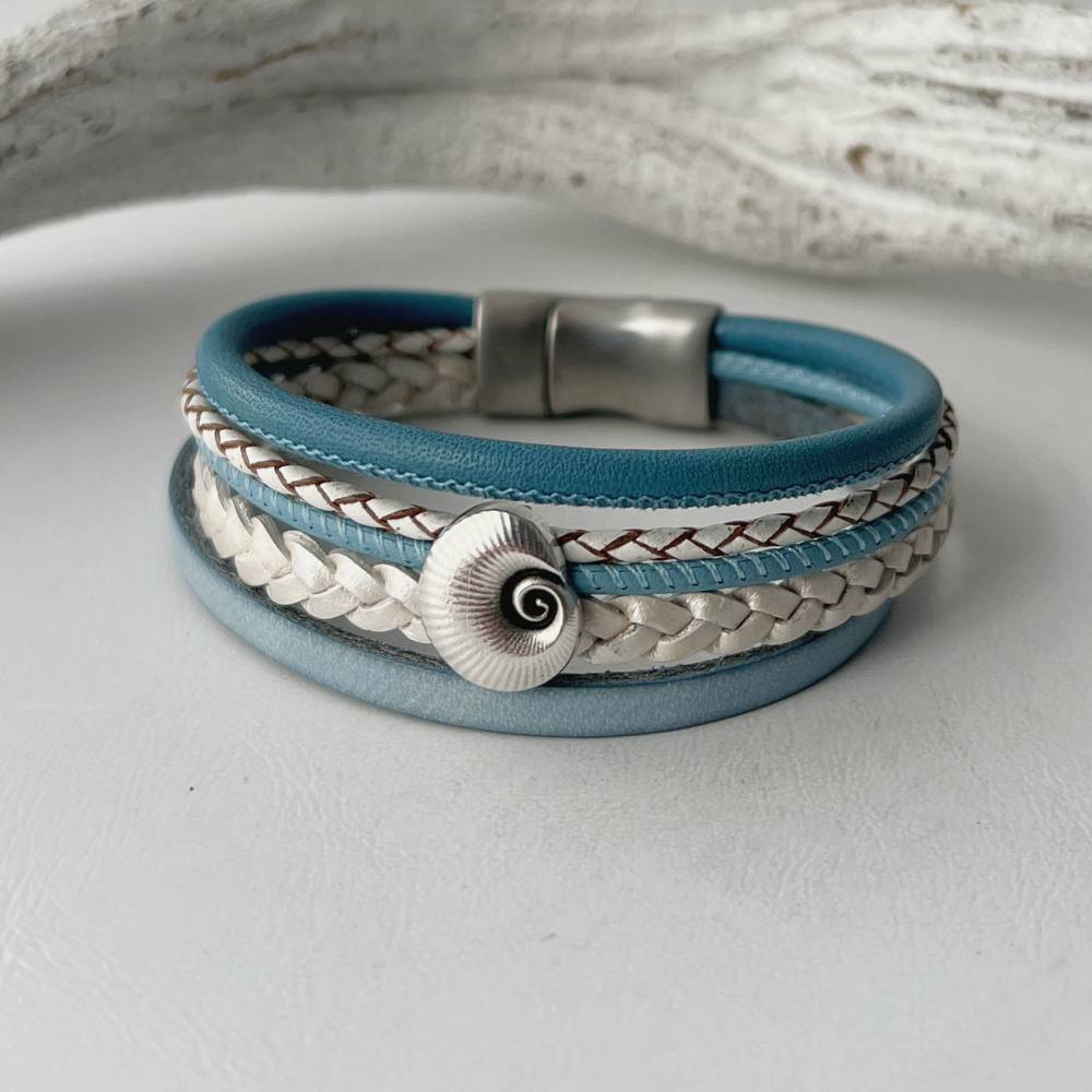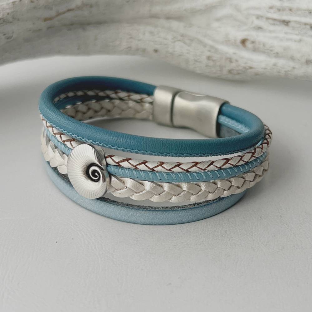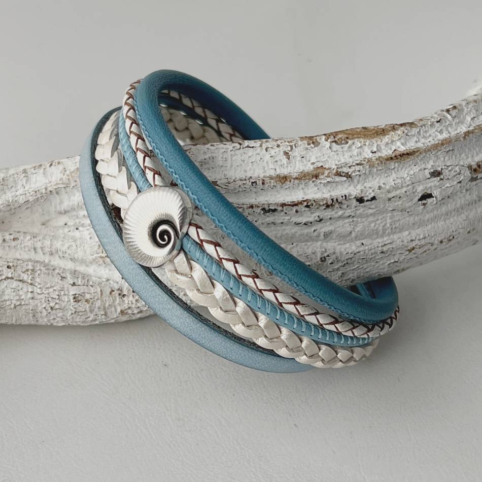 Das Lederarmband mit Muschel hellblau weiß ist ein echtes Sommerarmband! Mit seinen 5 verschiedenen Lederbändern und der schön geformten Muschel ist es ein echter Hingucker. Es lässt sich prima zu Jeans kombinieren.