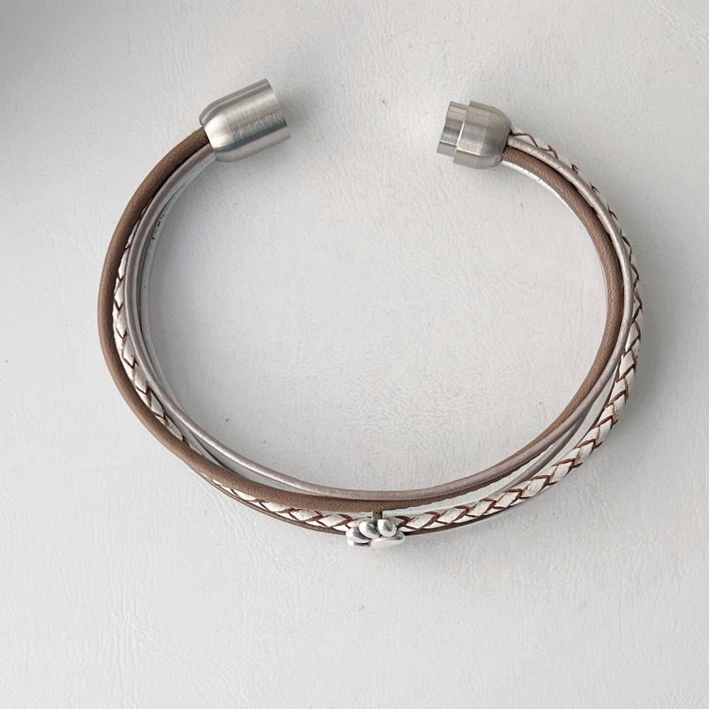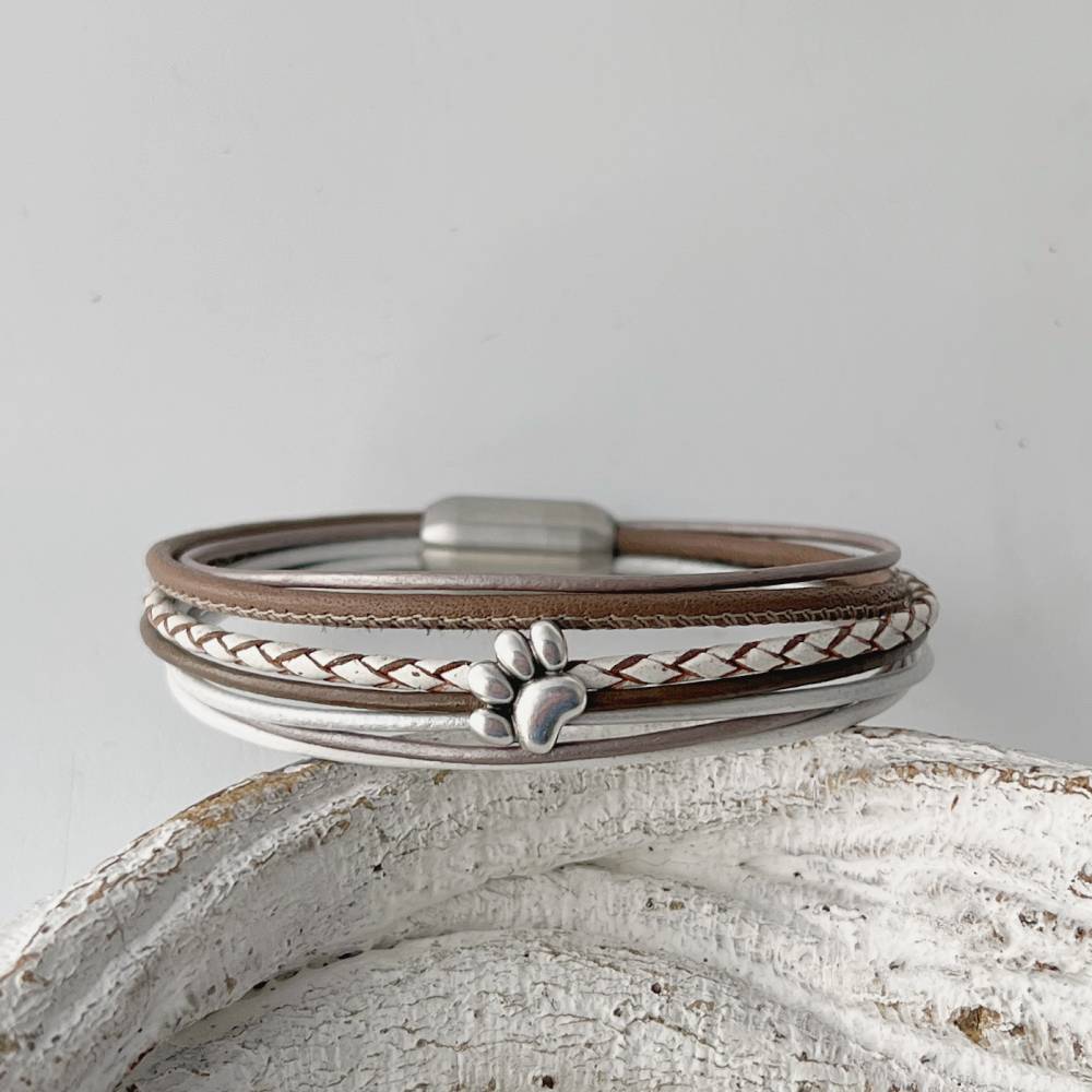 Das Lederarmband mit Pfote taupe weiß ist schön neutral von den Farben und ist sehr angenehm zu tragen. Die Grundlage bildet ein taupefarbenes Nappalederband (je ca. 2,5 mm) sowie ein geflochtenes Lederband (ca. 2,5 mm) in weiß. Dazu sind 5 farblich darauf abgestimmte Lederbänder in einer Stärke von ca. 1,5 mm kombiniert. Die Pfote hält 3 Lederbänder zusammen und die anderen Bänder liegen locker daneben.