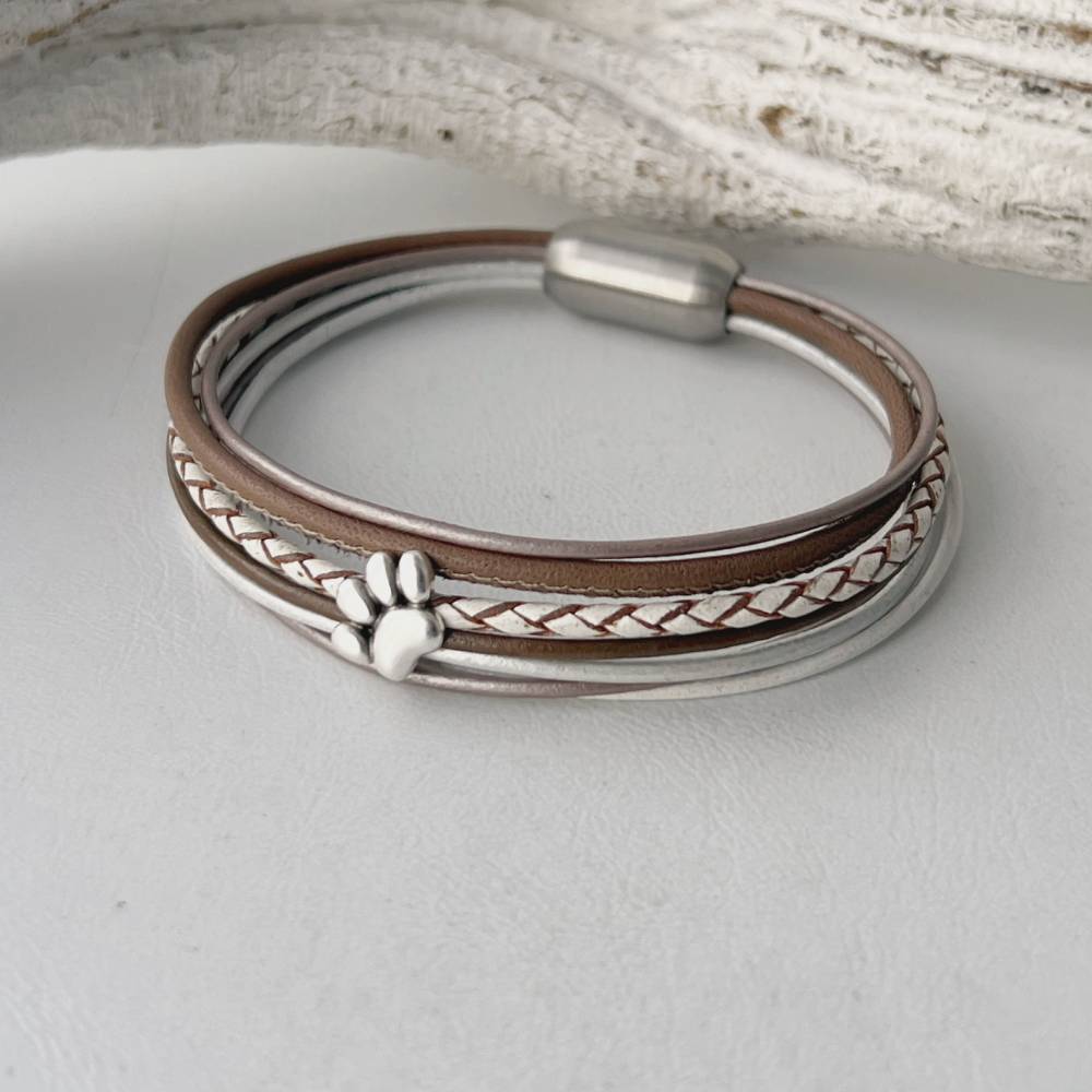 Das Lederarmband mit Pfote taupe weiß lässt sich mit Hilfe eines hochwertigen Edelstahl-Magnetverschlusses leicht an- und ablegen.