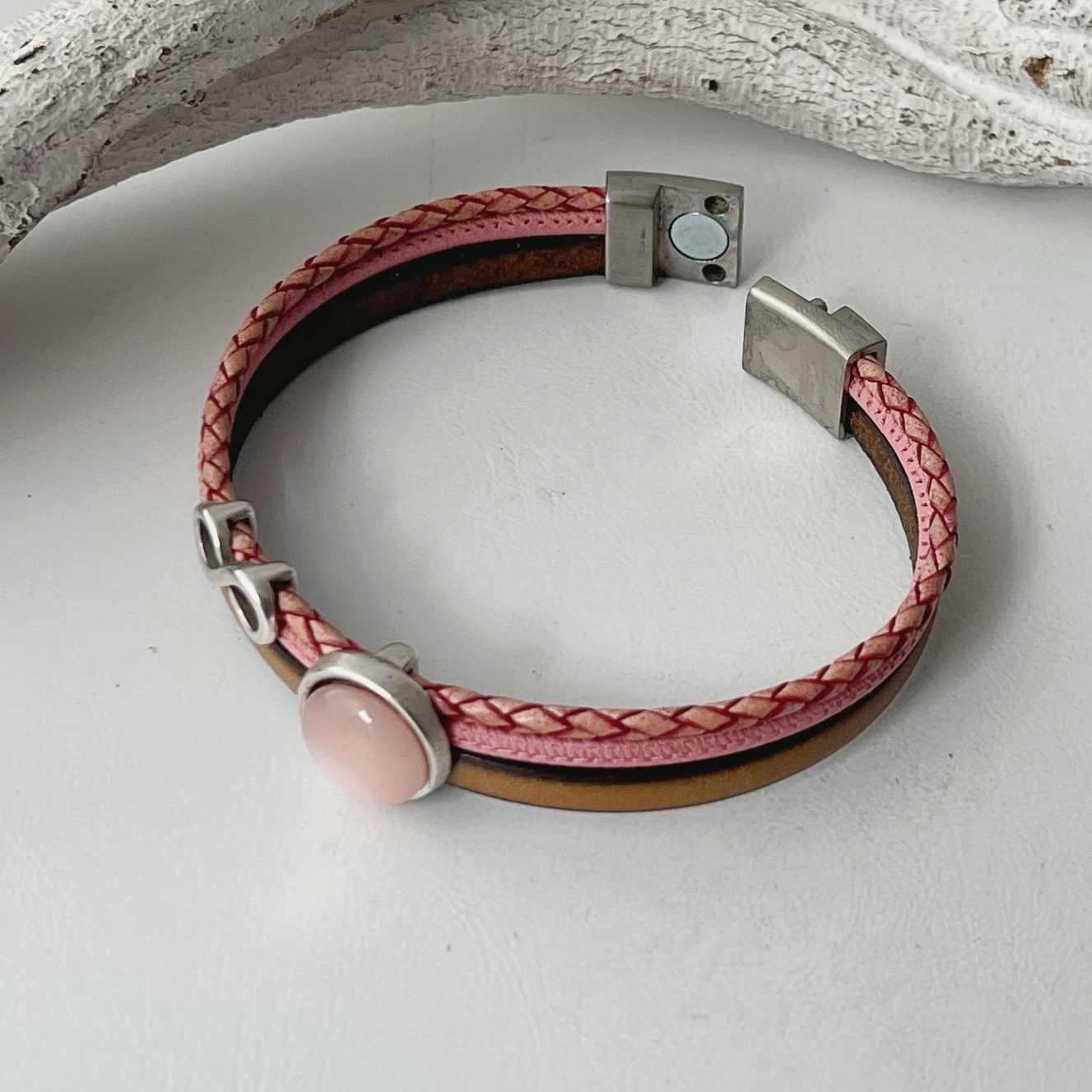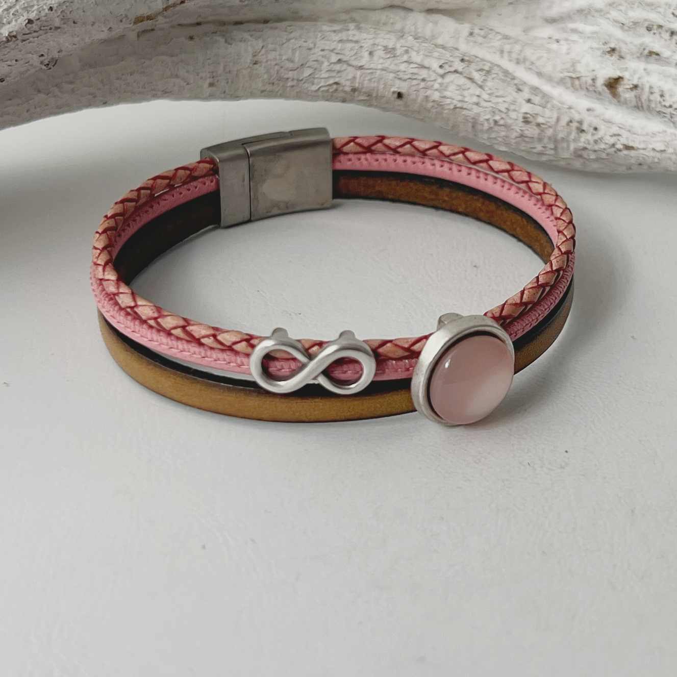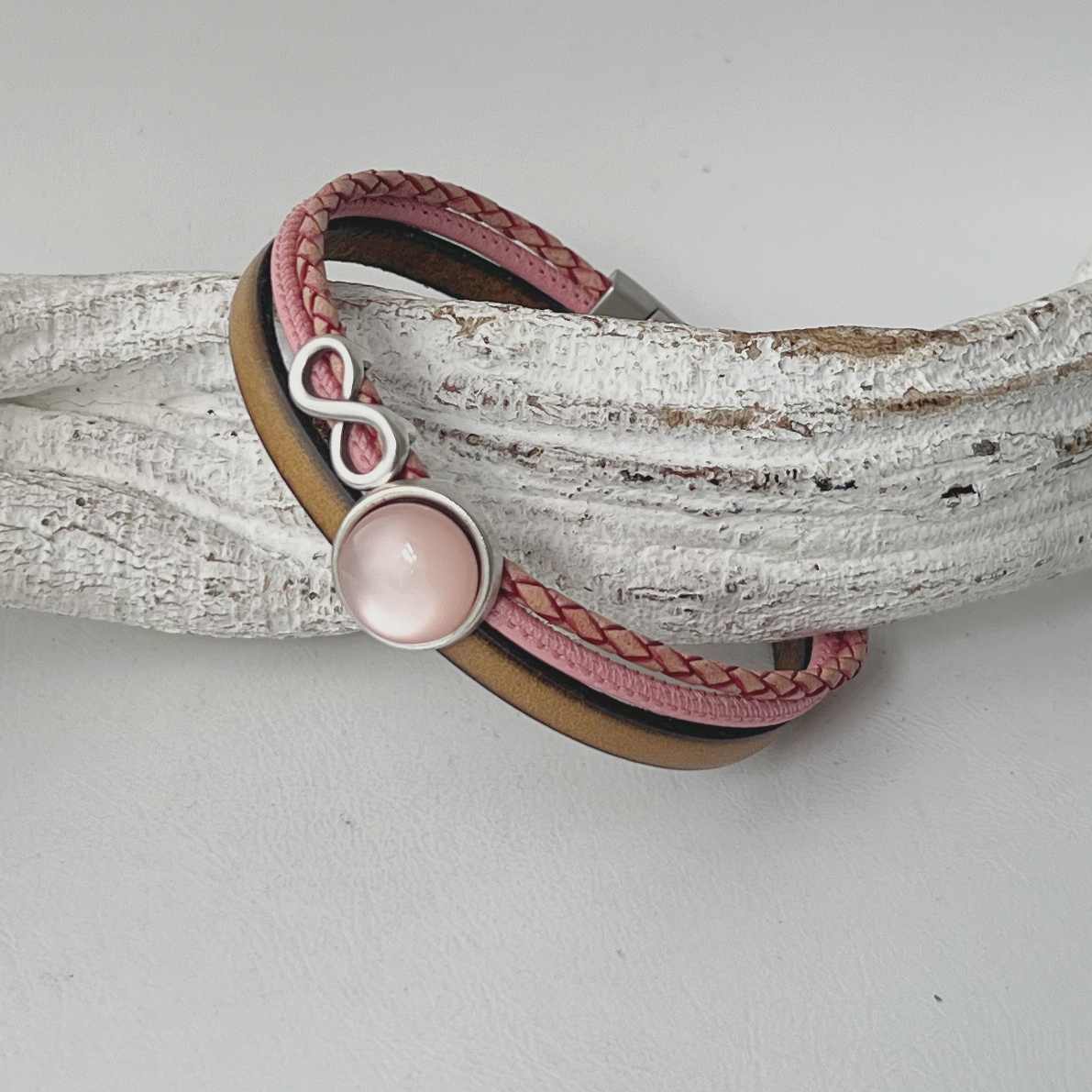 Das Schmuckstück besteht aus 3 Lederbändern: ein ca. 5 mm breites flaches Lederband (ca. 5 mm) in der Farbe beige, ein geflochtenes Lederband (ca. 2,5 mm) in der Farbe antikrosa und ein rosa Nappalederband (ca. 2,5 mm). Die drei Bänder werden mit einem schönen glänzenden rosa Cabochon mit zusammengehalten. Ein kleines Infinityzeichen komplettiert das Armband.
