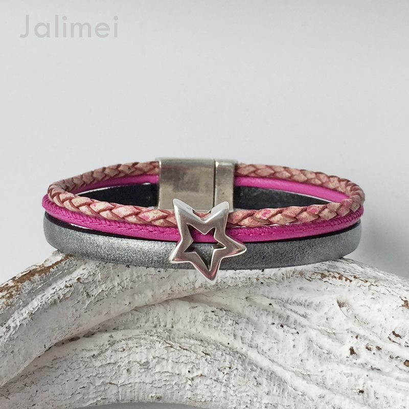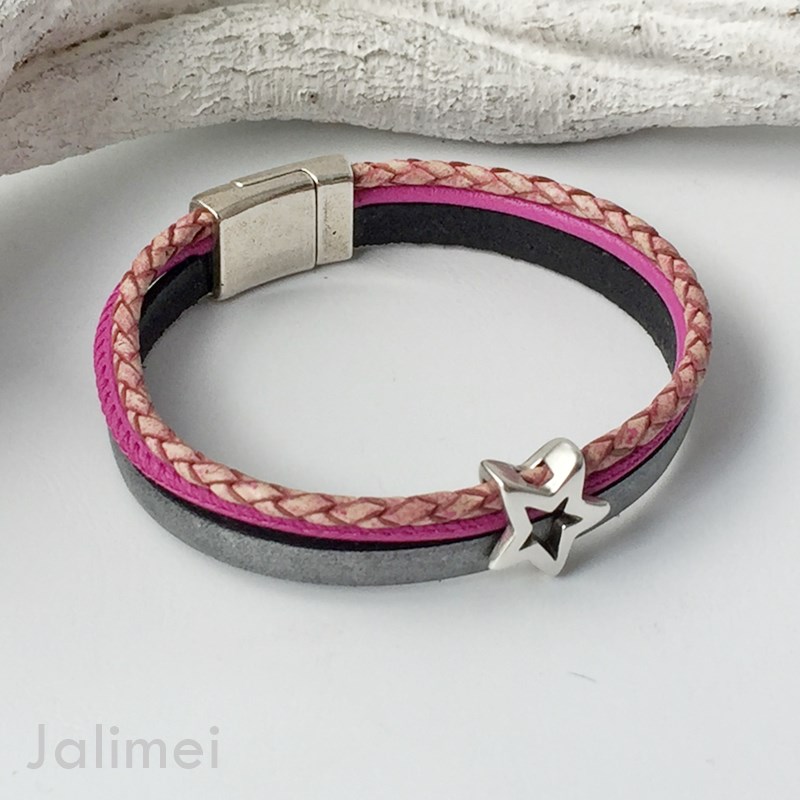 Schönes Armband bestehend aus 3 Lederbändern in den Farben stahlgrau, antikrosa und oink. Aufgepeppt ist es mit einem Metallschieber Stern.
