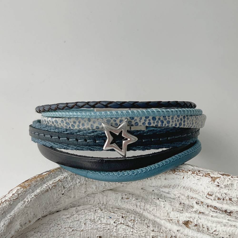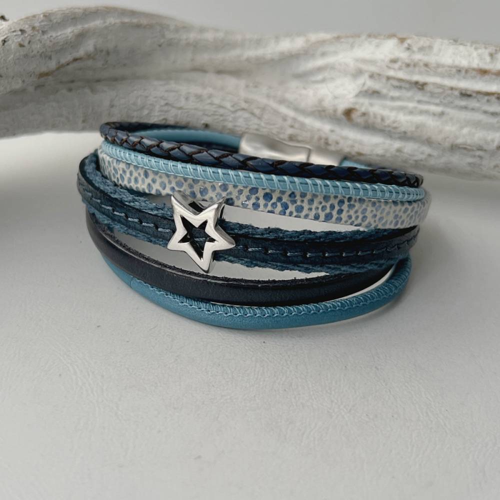 Du trägst gern Jeans? Dann passt das Lederarmband mit Stern blau gut zu Dir!