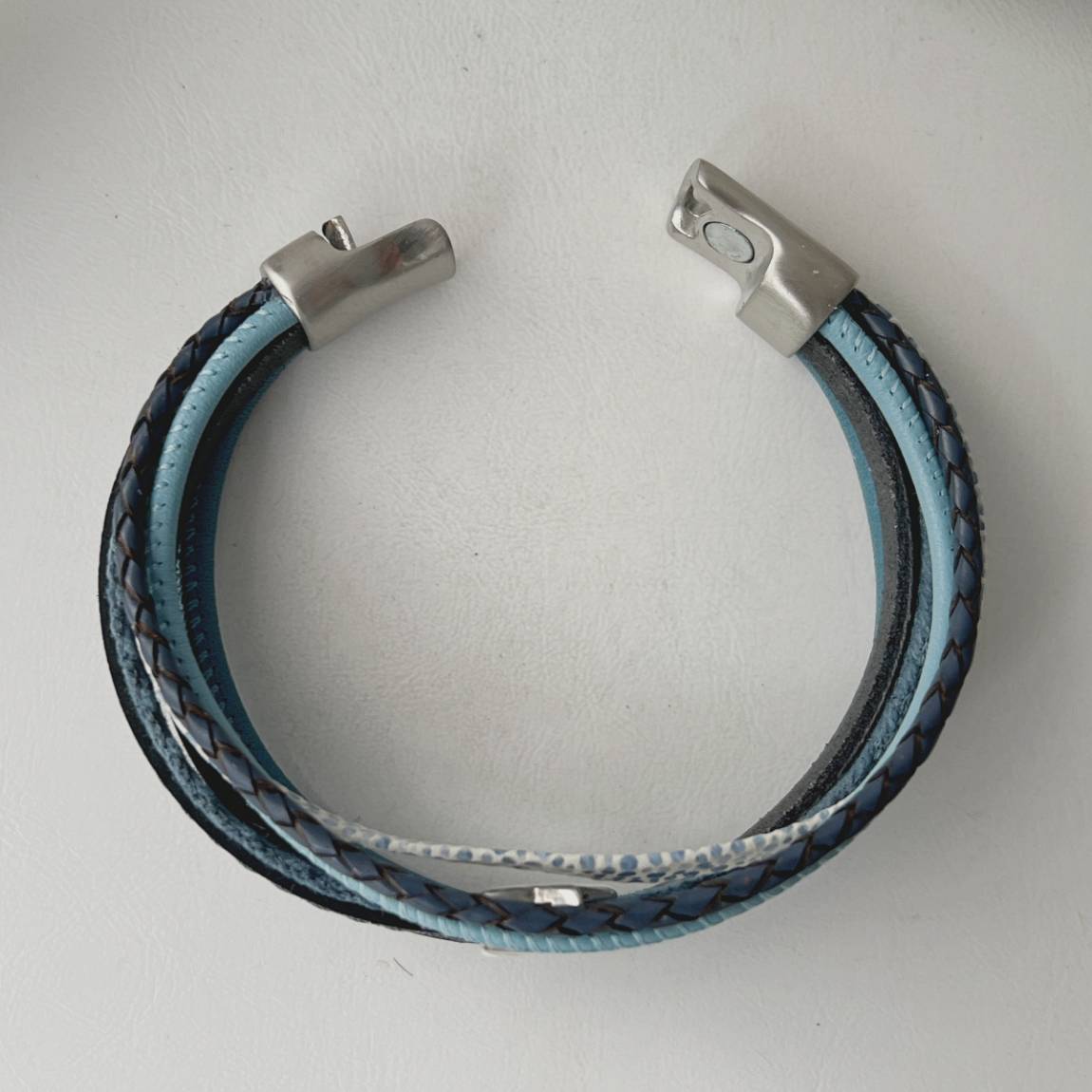 Es ist aus 6 verschiedenen Lederbändern gefertigt. Ein mit flachem Leder besetztes Stoffband (ca. 8 mm), ein Flachriemen (ca. 5 mm) in anthrazit, ein Nappalederband mit Rochenprägung (ca. 5 mm), ein gesäumtes Nappalederband in hellblau (ca. 4 mm), ein gesäumtes Nappalederband blau und ein geflochtenes Lederband in dunkelblau (beide ca. 2,5 mm).