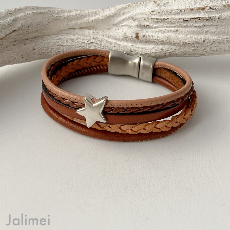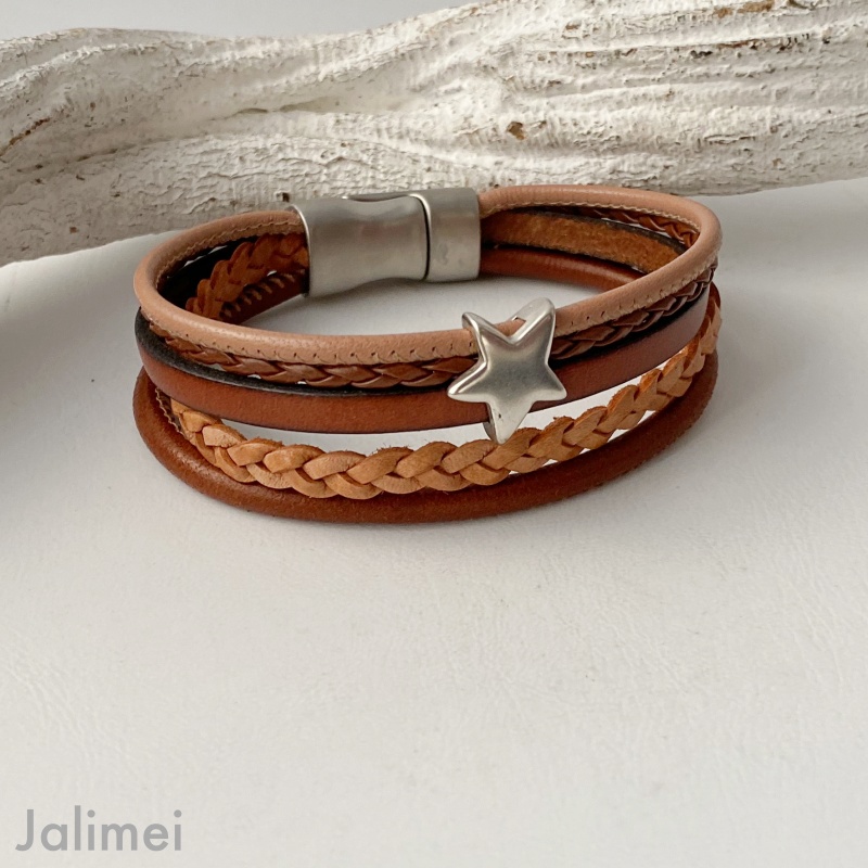 Das Lederarmband mit Stern braun ist aus warmen Brauntönen gefertigt. Es besteht aus 5 verschiedenen Lederbändern und ist aufgepeppt mit einem schönen Metallschieber Stern. Das Lederarmband mit Stern braun lässt sich mit Hilfe eines hochwertigen Edelstahl-Magnetverschlusses leicht an- und ablegen.