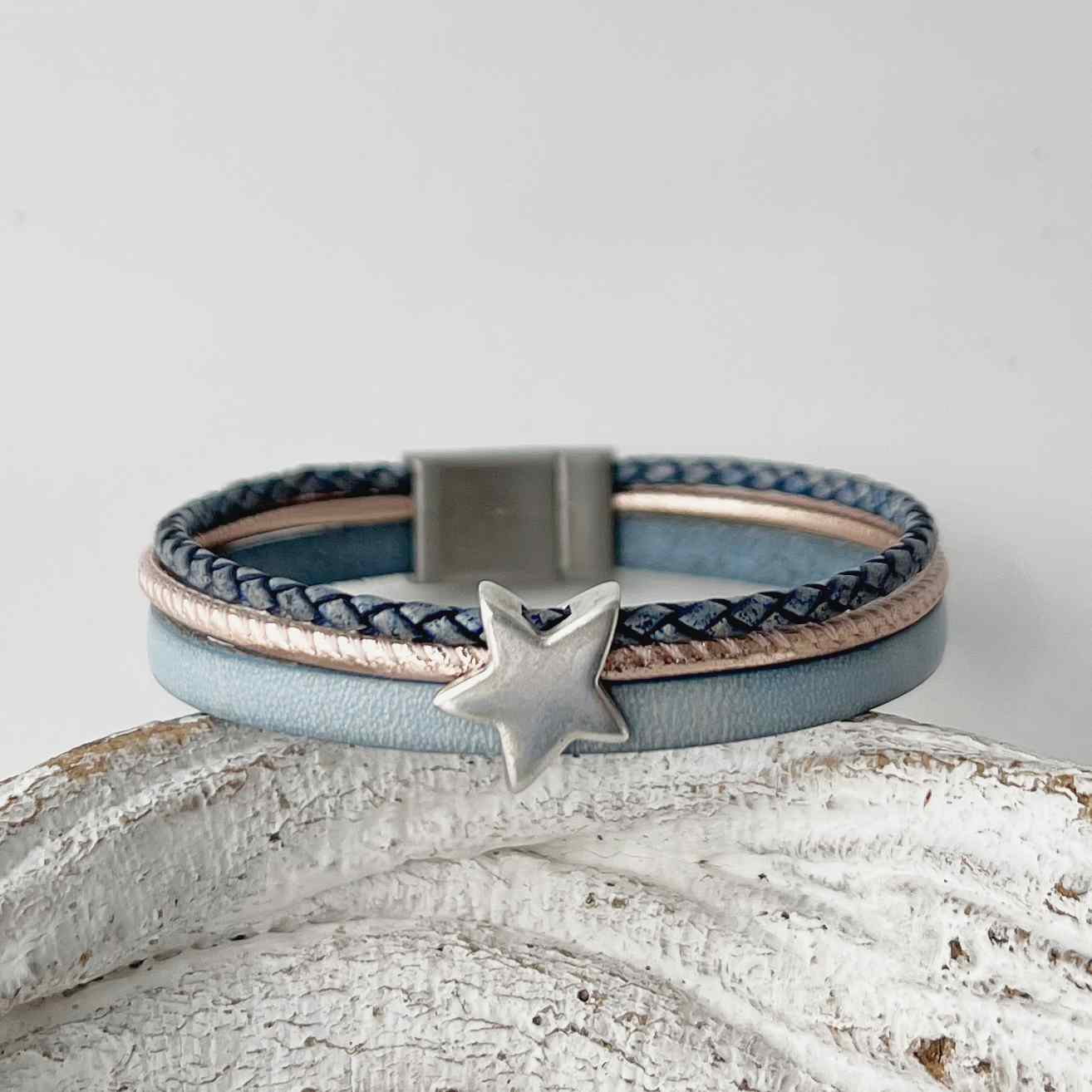 Die drei echten Lederbänder in den Farben hellblau, rosegold und antikblau werden von einem Metallstern zusammengehalten.