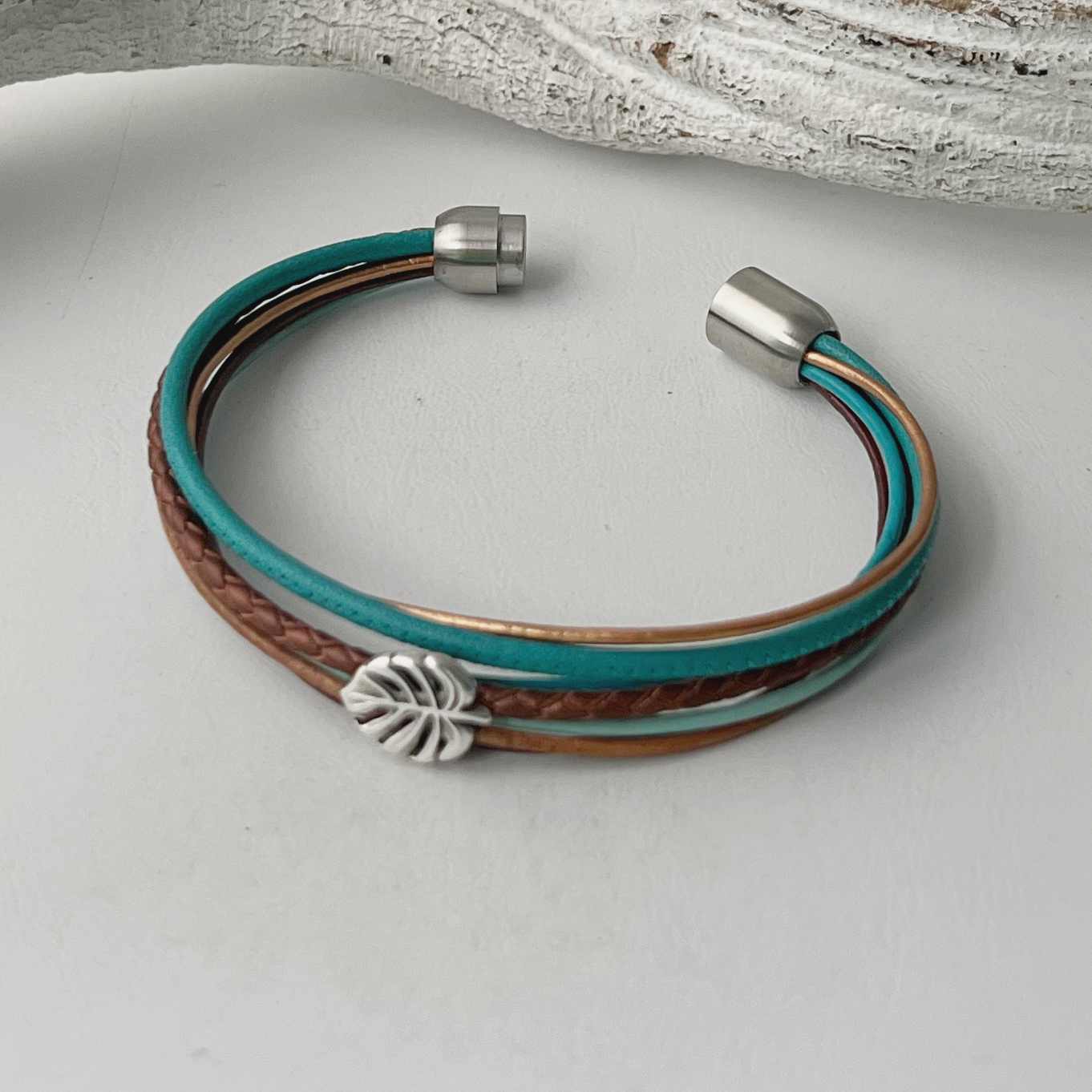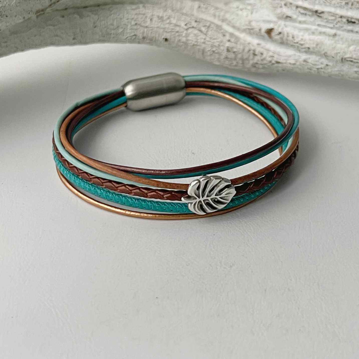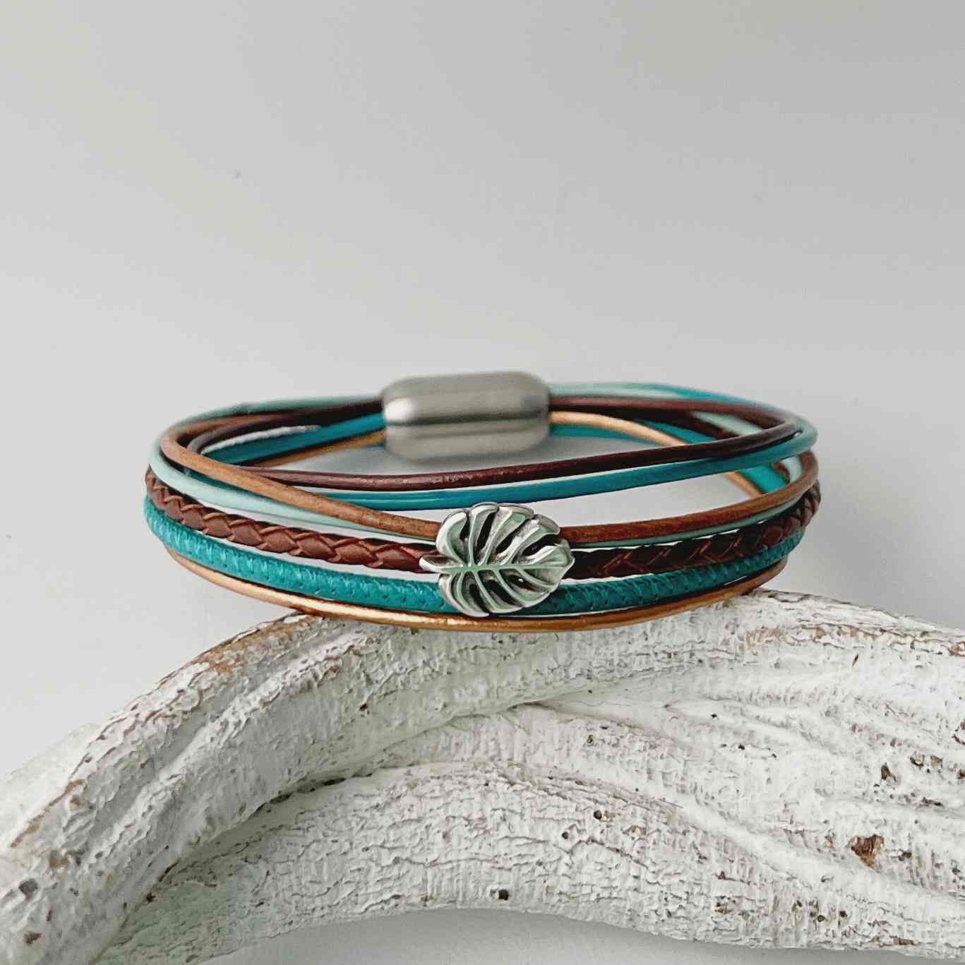 Verarbeitet sind türkises Nappalederband (ca. 2,5 mm), ein geflochtenes Lederband (ca. 2,5 mm) in schokometallic und 5 dazu farblich abgestimmte Lederbänder (je ca. 1,5 mm). Aufgepeppt ist das Armband mit einem Monsterablatt (ca. 11 x 14 mm), das drei Bänder zusammenfasst.