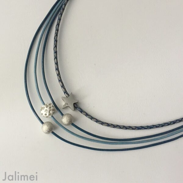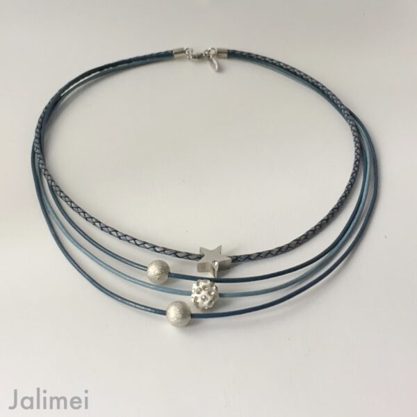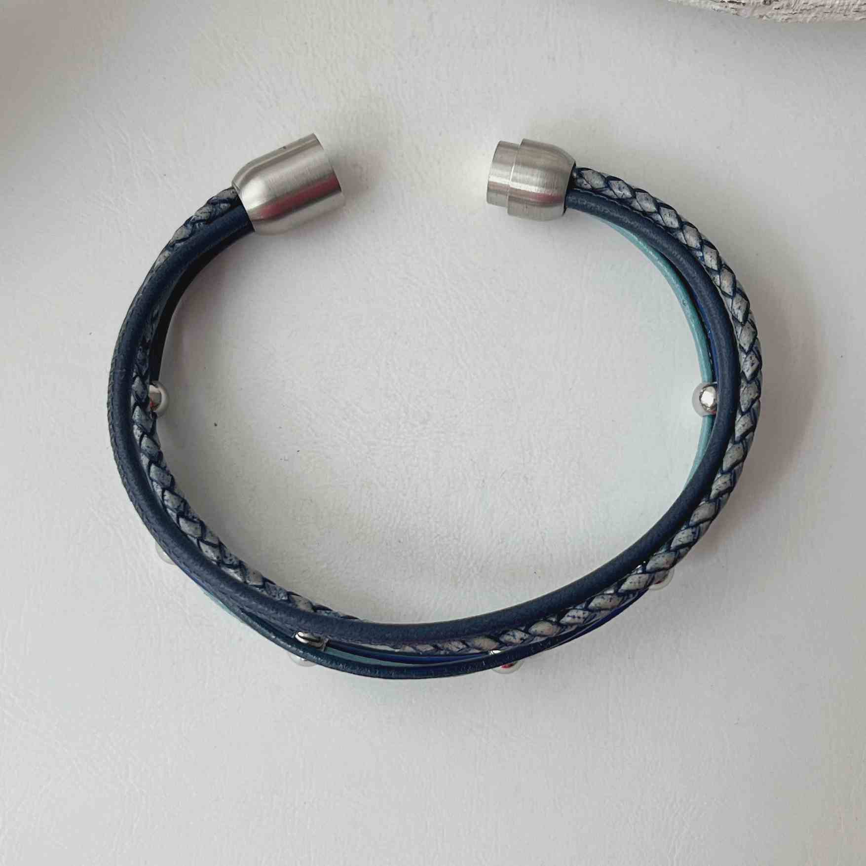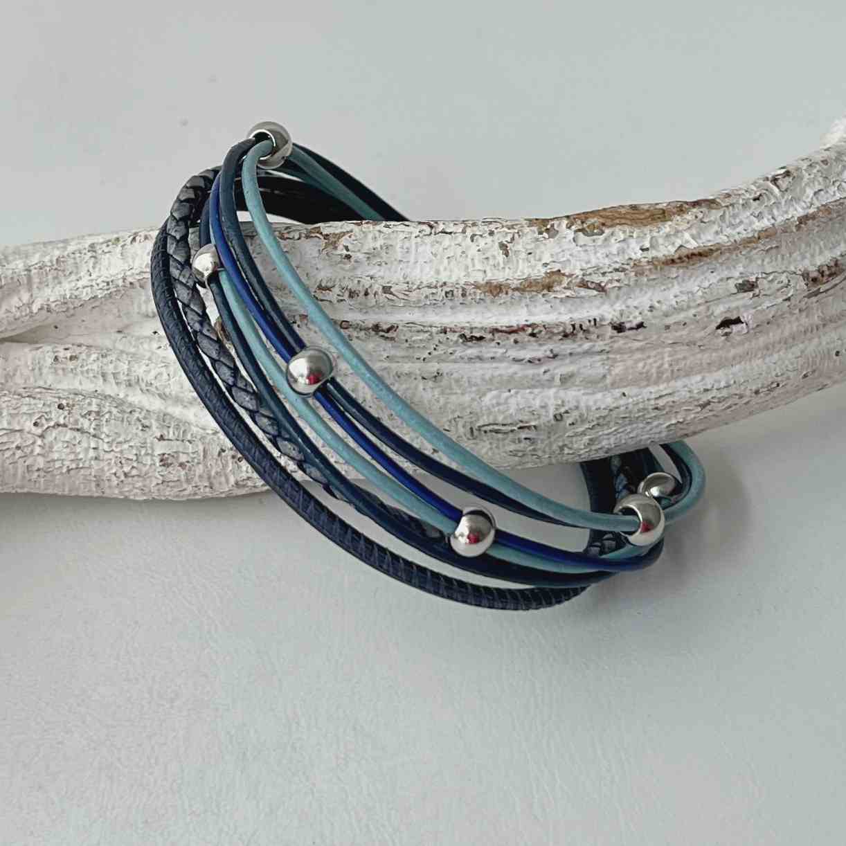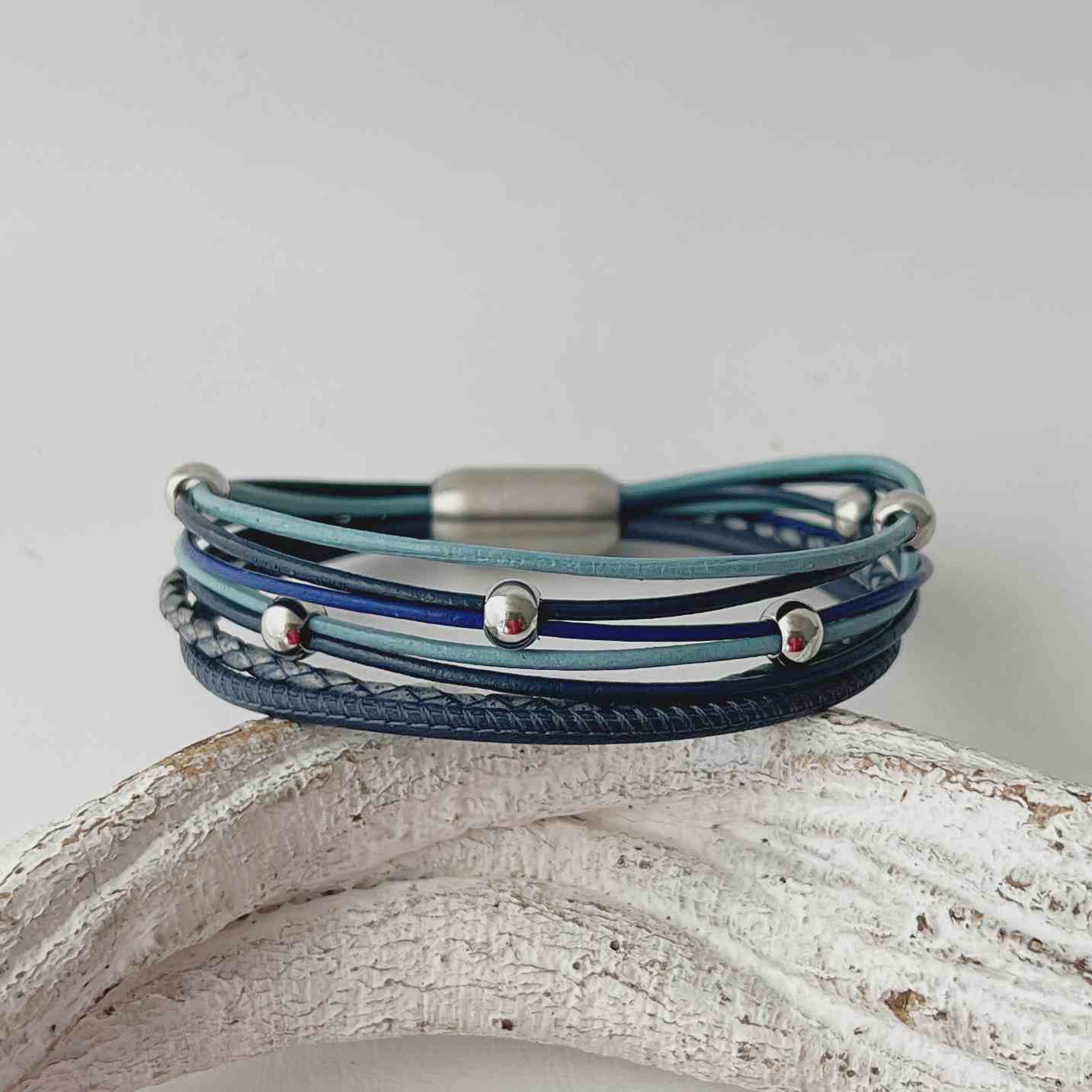 Das Armband ist aus echtem hochwertigen Leder gefertigt: einem geflochtenen Lederband (ca. 2,5 mm) in der Farbe antikblau, einem dunkelblauen Nappalederband (ca. 2,5 mm) sowie 5 farblich darauf farblich abgestimmte dünneren Lederbänder gefertigt. Die angebrachten Edelstahlperlen verleihen dem Lederarmband Nappa antikblau einen modernen Touch. Sie sind gleichmäßig über das Armband verteilt und verleihen ihm einen harmonischen Look.