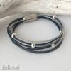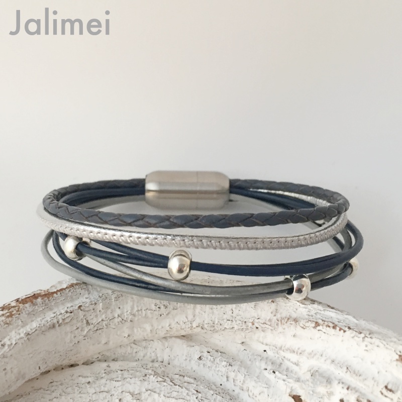 Schönes Armband aus Lederbändern in den Farben dunkelblau, silber und grau. Verwendet sind 6 Lederbänder (1,5 mm stark) sowie je einem 2,5 mm starken Nappa- und einem geflochtenes Lederband. Aufgepeppt ist das Armband mit kleinen versilberten Perlchen, die teilweise verschiebbar sind. Es wird mit einem hochwertigen Edelstahlmagnetverschluß geschlossen.