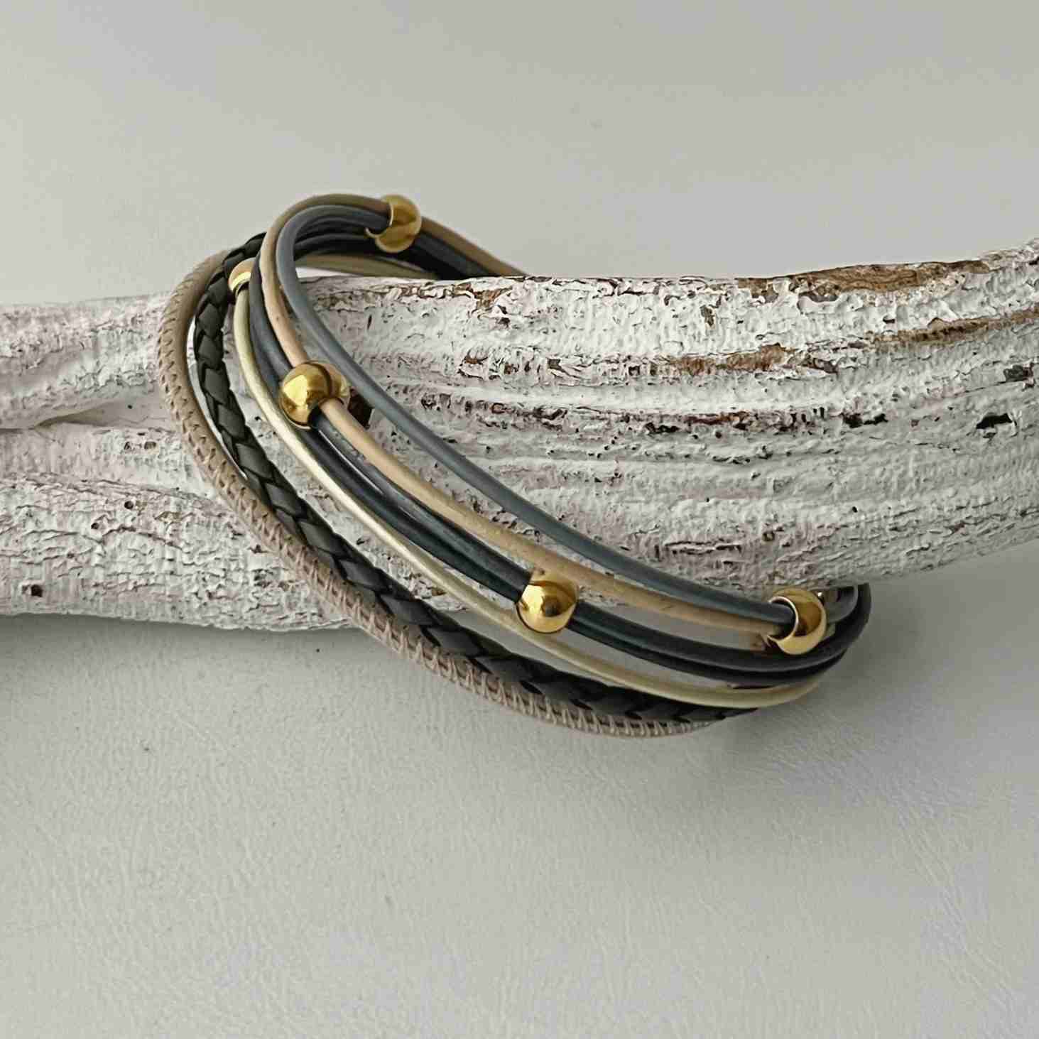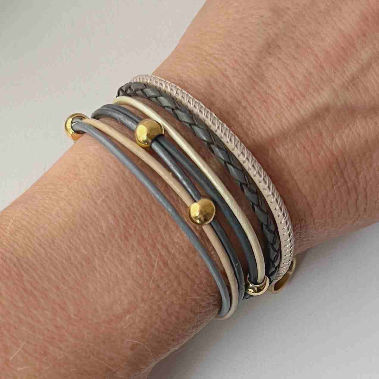 In dem Armband sind ein Beiges Nappalederband (ca. 2,5 mm), ein geflochtenes Lederband (ca. 2,5 mm) in dunkelgrau und 5 Lederbändern in dazu passenden Farben (ca. 1,5 mm) verarbeitet. Die weichen Lederbänder verleihen dem Armband ein angenehmes Tragegefühl.