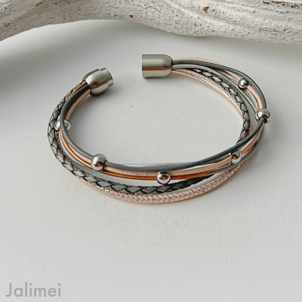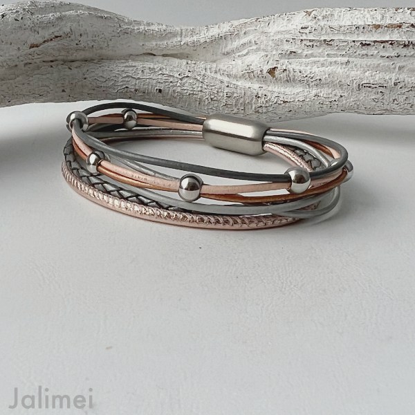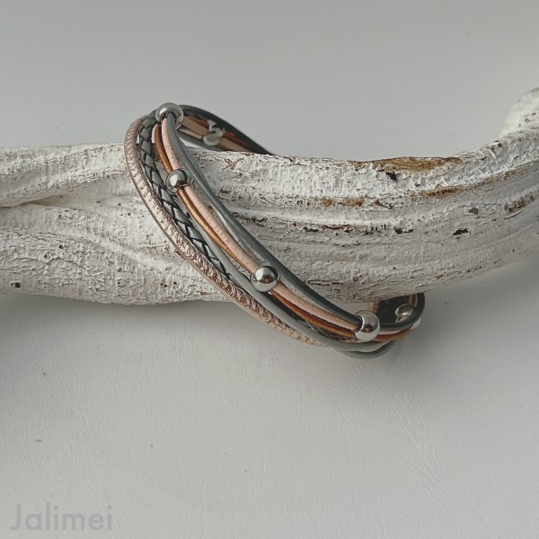 In dem Armband sind ein rossgoldfarbenes Nappalederband (ca. 2,5 mm), ein geflochtenes Lederband (ca. 2,5 mm) in stahlgrau und 5 Lederbändern in dazu passenden Farben (ca. 1,5 mm) verarbeitet. Die weichen Lederbänder verleihen dem Armband ein angenehmes Tragegefühl.