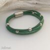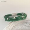 Schönes Armband aus Lederbändern in schönen kräftigen Grüntönen. Verwendet sind 6 Lederbänder (1,5 mm stark) sowie je einem 2,5 mm starken Nappa- und einem geflochtenes Lederband. Aufgepeppt ist das Armband mit kleinen Edelstahl-Perlchen, die teilweise verschiebbar sind. Es wird mit einem hochwertigen Edelstahlmagnetverschluß geschlossen.