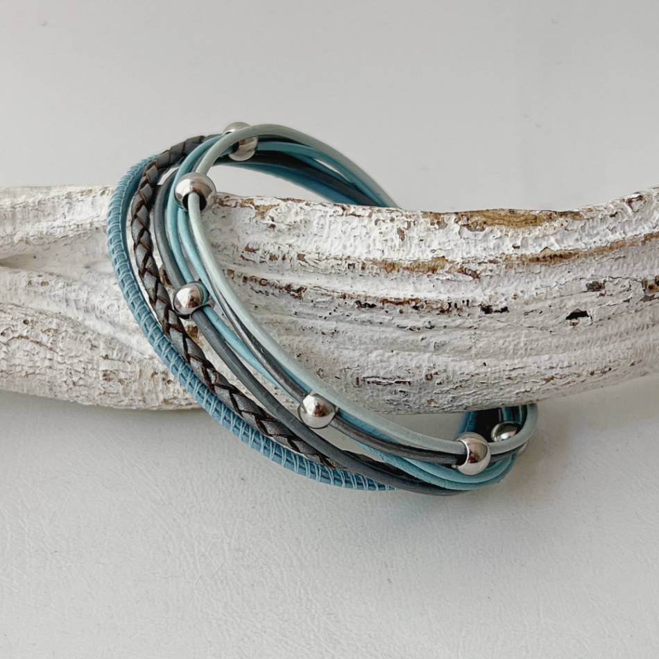 In dem Armband sind ein rauchblaues Nappalederband (ca. 2,5 mm), ein geflochtenes Lederband (ca. 2,5 mm) in stahlgrau und 5 Lederbändern in dazu passenden Farben (ca. 1,5 mm) verarbeitet. Die weichen Lederbänder verleihen dem Armband ein angenehmes Tragegefühl.