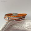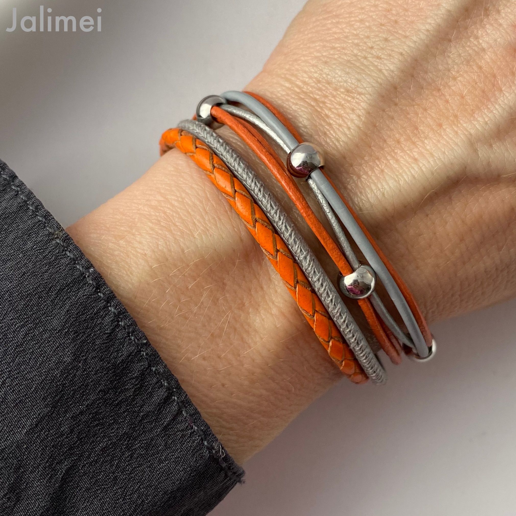 Schönes Armband aus Lederbändern in der aktuellen Farbe orange gepaart mit hellgrau. Verwendet sind 1,5 mm starke Lederbänder sowie ein Nappa- und ein geflochtenes Lederband. Aufgepeppt ist das Armband mit kleinen Edelstahlperlchen, die teilweise verschiebbar sind. Es wird mit einem hochwertigen Edelstahlmagnetverschluß geschlossen.