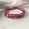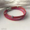 Schönes Armband aus Lederbändern in den Sommerfarben pink und rot. Verwendet sind 6 Lederbänder (1,5 mm stark) sowie je einem 2,5 mm starken Nappa- und einem geflochtenes Lederband. Aufgepeppt ist das Armband mit kleinen Edelstahl-Perlchen, die teilweise verschiebbar sind. Es wird mit einem hochwertigen Edelstahlmagnetverschluß geschlossen.