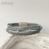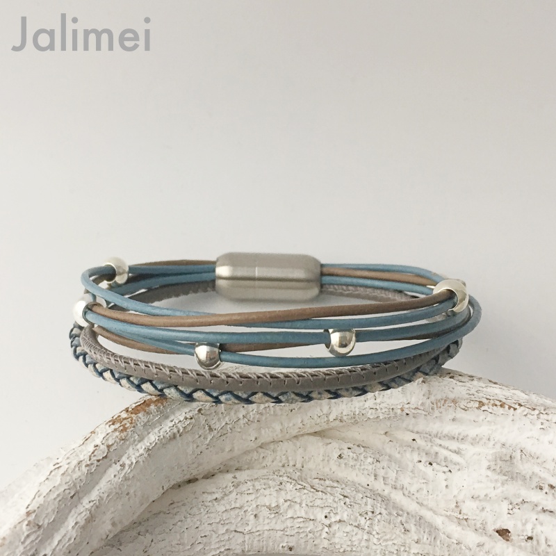 Schönes Armband aus Lederbändern in den Farben blau und taupe. Verwendet sind 1,5 mm starke Lederbänder sowie ein Nappa- und ein geflochtenes Lederband. Aufgepeppt ist das Armband mit kleinen versilberten Perlchen, die teilweise verschiebbar sind. Es wird mit einem hochwertigen Edelstahlmagnetverschluß geschlossen.