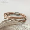 Schönes Armband aus Lederbändern in den Farben rosegold, weiß und bronze. Verwendet sind 1,5 mm starke Lederbänder sowie ein Nappa- und ein geflochtenes Lederband. Aufgepeppt ist das Armband mit kleinen versilberten Perlchen, die teilweise verschiebbar sind. Es wird mit einem hochwertigen Edelstahlmagnetverschluß geschlossen.