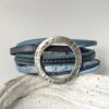 Schönes Armband bestehend aus 6 verschiedenen Lederbändern in Blautönen. Aufgepeppt ist es mit einem Metallschieber offene Scheibe und wird mit einem Magnetverschluß geschlossen.