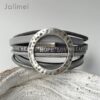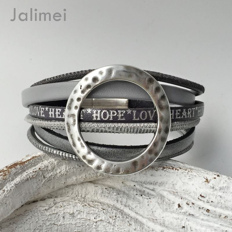 Schönes Armband bestehend aus 6 verschiedenen Lederbändern in Grautönen. Aufgepeppt ist es mit einem Metallschieber offene Scheibe und wird mit einem Magnetverschluß geschlossen.