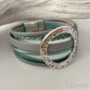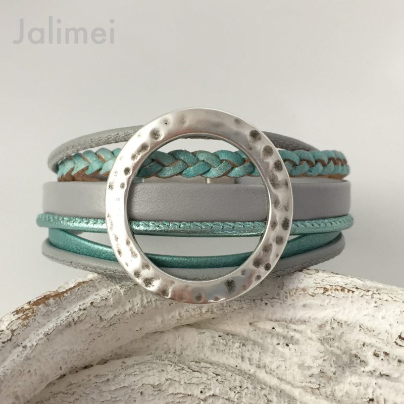 Schönes Armband bestehend aus 6 verschiedenen Lederbändern in den Farben mint und grau. Aufgepeppt ist es mit einem Metallschieber offene Scheibe und wird mit einem hochwertigen Edelstahl-Magnetverschluß geschlossen.