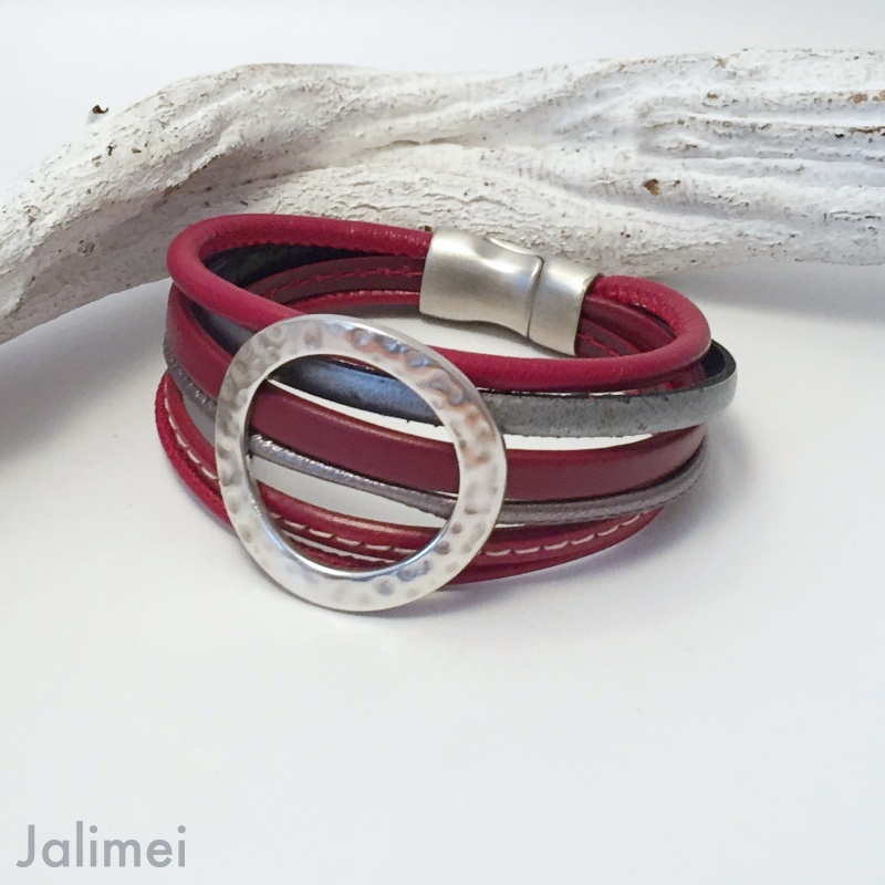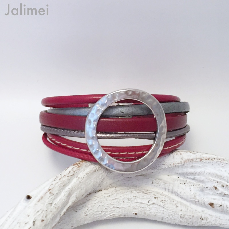 Schönes Armband bestehend aus 6 verschiedenen Lederbändern in den Farben weinrot und grau. Aufgepeppt ist es mit einem Metallschieber offene Scheibe und wird mit einem hochwertigen Edelstahl-Magnetverschluß geschlossen.
