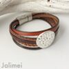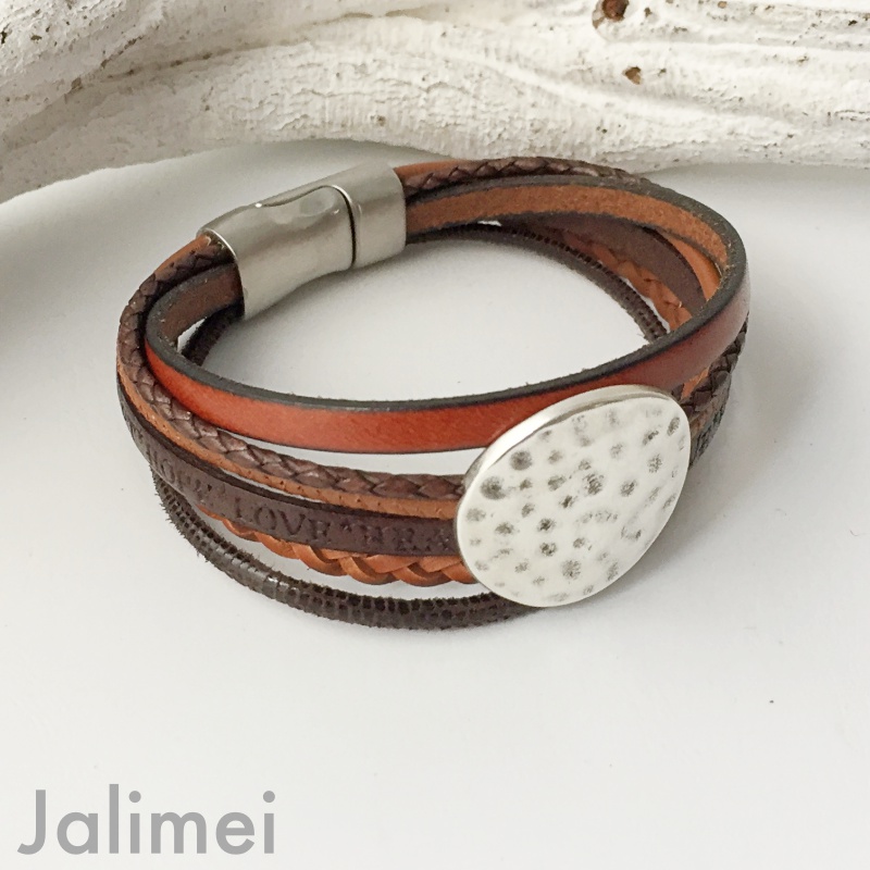 Armband bestehend aus 6 verschiedenen Lederbändern in Brauntönen. Aufgepeppt ist es mit einem schönen Metallschieber Scheibe. Geschlossen wird das Armband mit einem hochwertigen Edelstahl-Magnetverschluß.