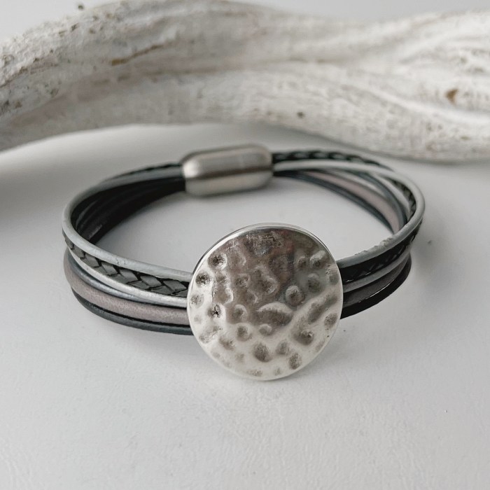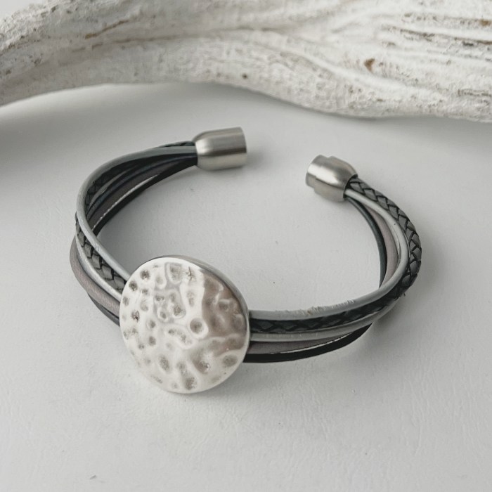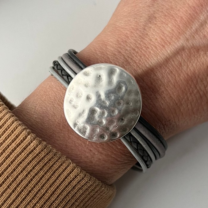 Du suchst ein neutrales Schmuckstück, das aber trotzdem Aussagekraft hat? Dann schau Dir das Lederarmband mit gehämmerter Scheibe grau an! Es ist von den Lederfarben neutral gehalten und die gehämmerte Scheibe ist einfach schön.