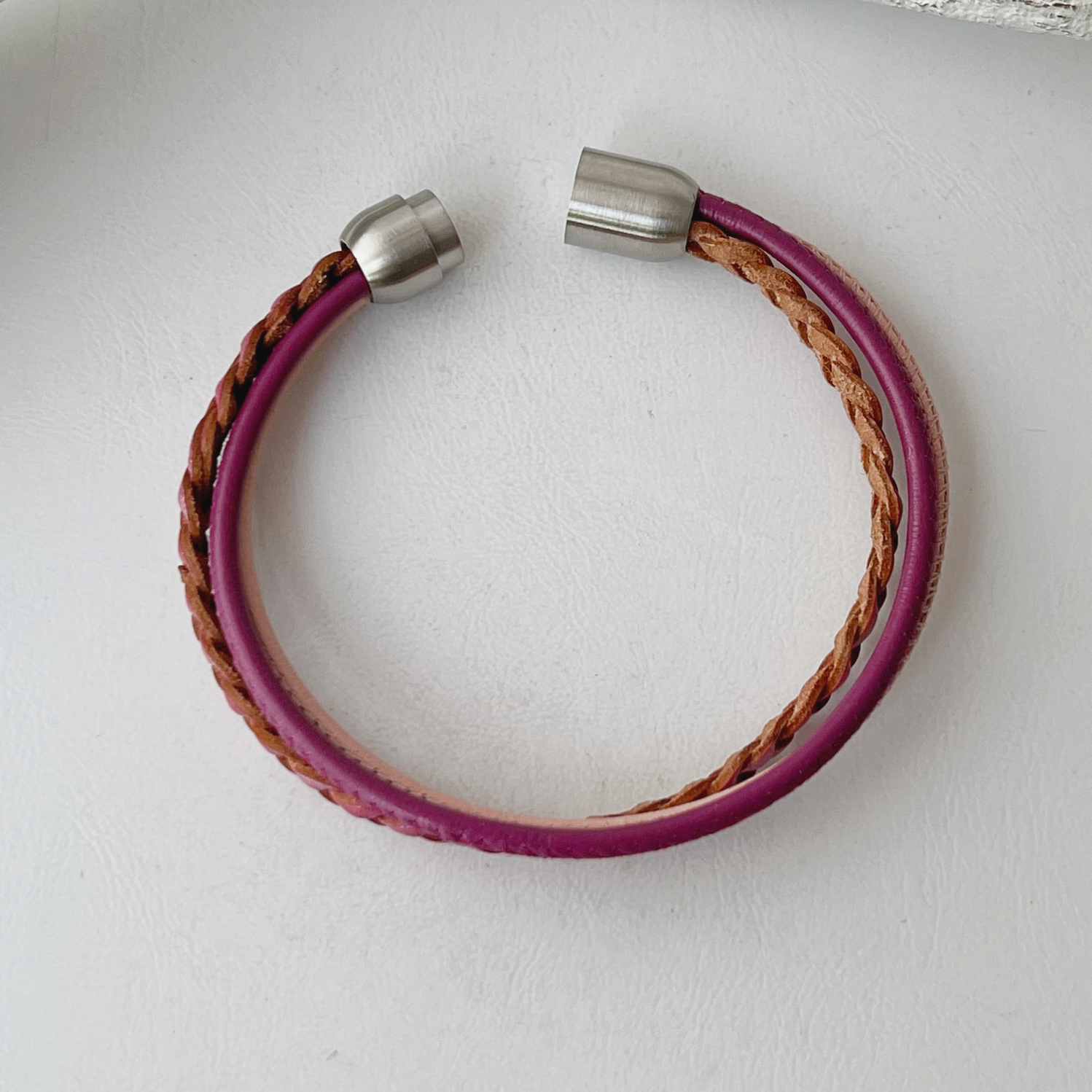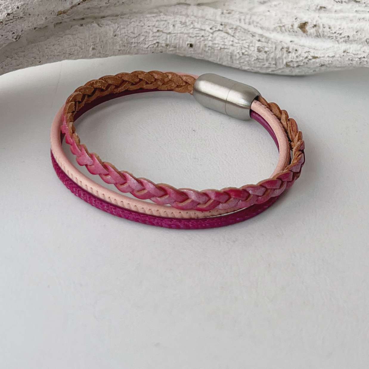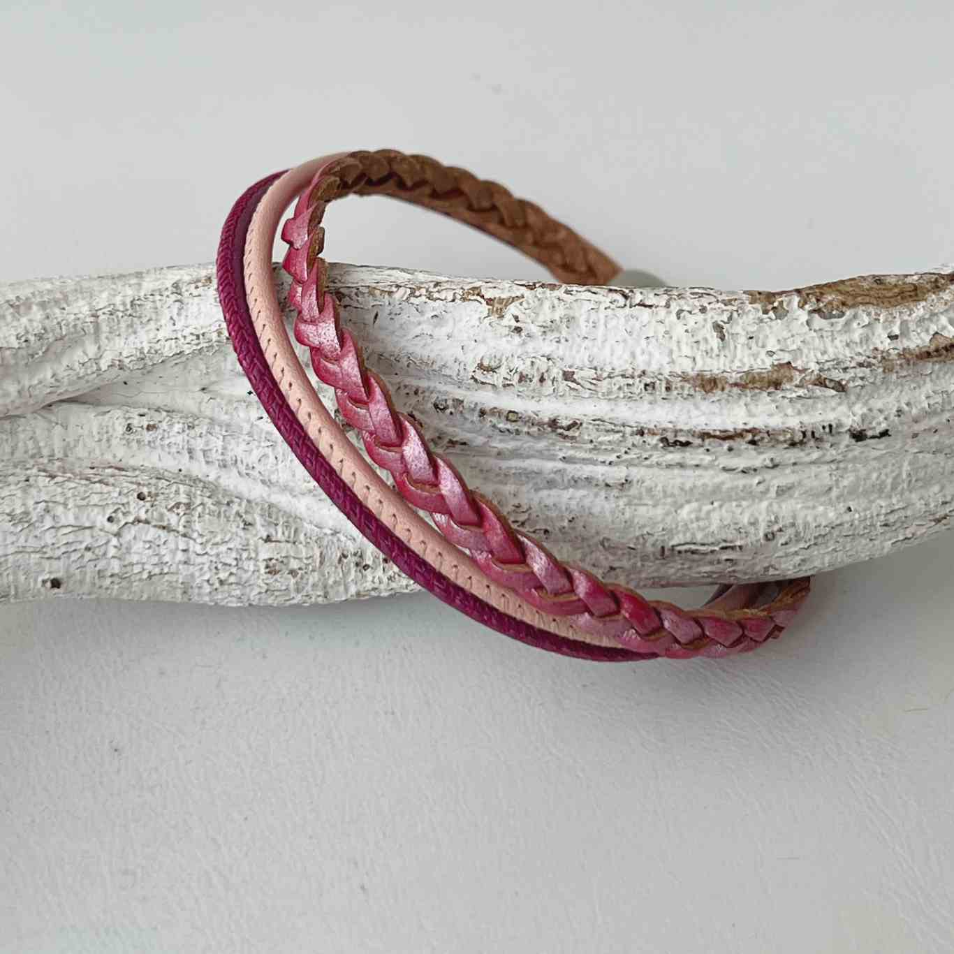 Es ist aus einem geflochtenen flachen Lederband (ca. 5 mm) mit einer leichten Metallicoberfläche in pink sowie zwei Nappalederbändern (ca. 2,5 mm) in rosa und pink gefertigt.