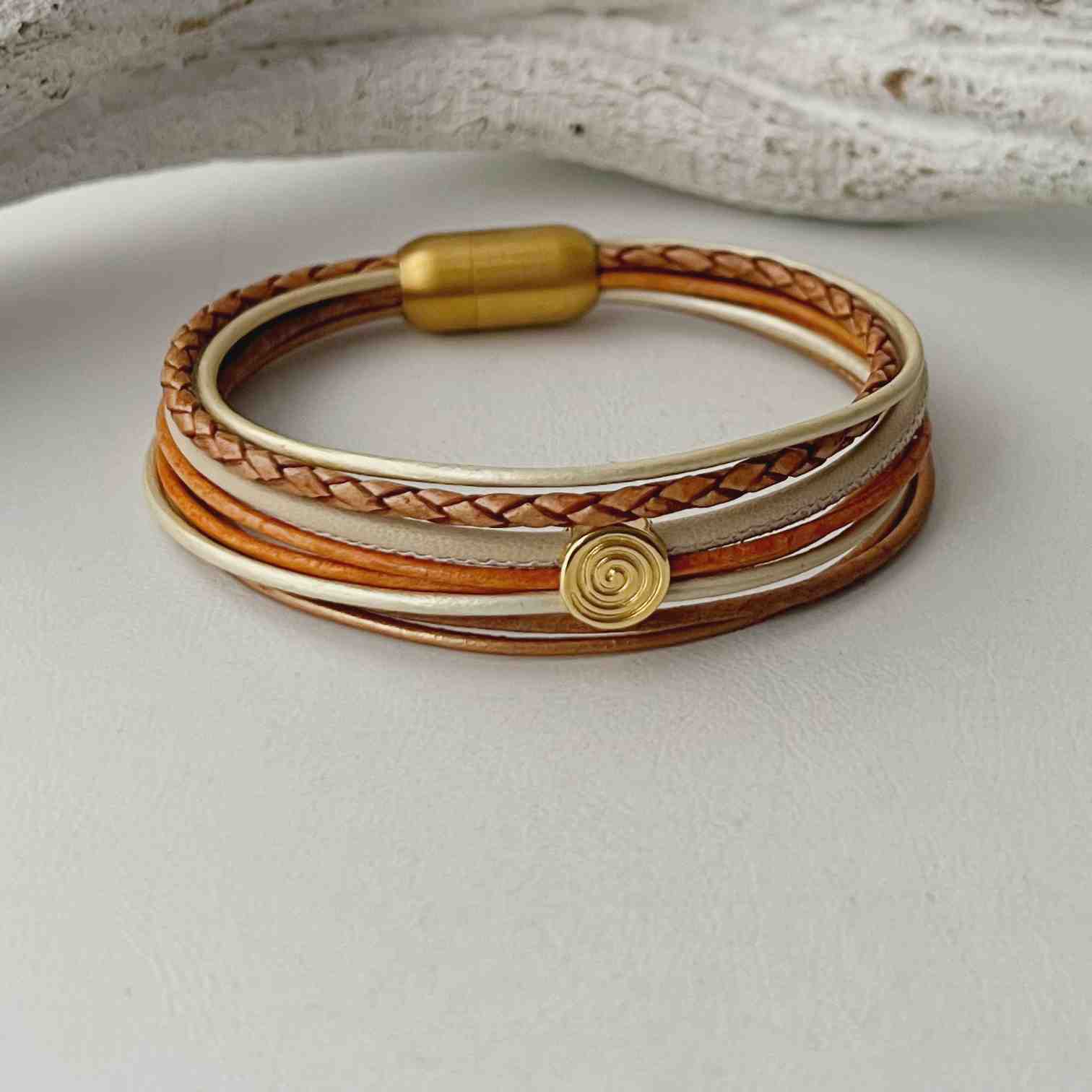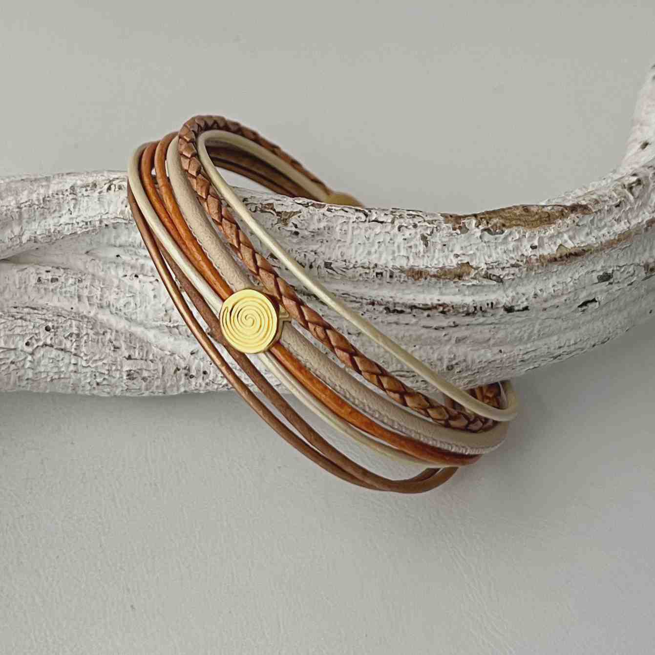 Dieses schöne Lederarmband Spirale Gold braun beige besticht durch seine warmen Farben!
