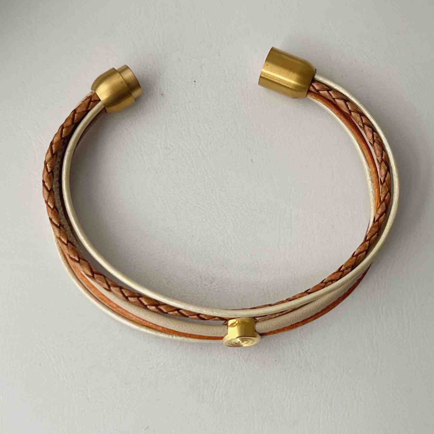 Verarbeitet ist ein geflochtenes Lederband (ca. 2,5 mm) in antikhellbraun, ein gesäumtes Nappalederband (ca. 2,5 mm) in poudre sowie 5 farblich dazu abgestimmte Lederbänder mit einer Stärke von ca. 1,5 mm. Aufgepeppt ist das Armband mit einer kleinen vergoldetem Spirale (ca. 8 mm), durch das einige Bänder zusammenfasst sind.