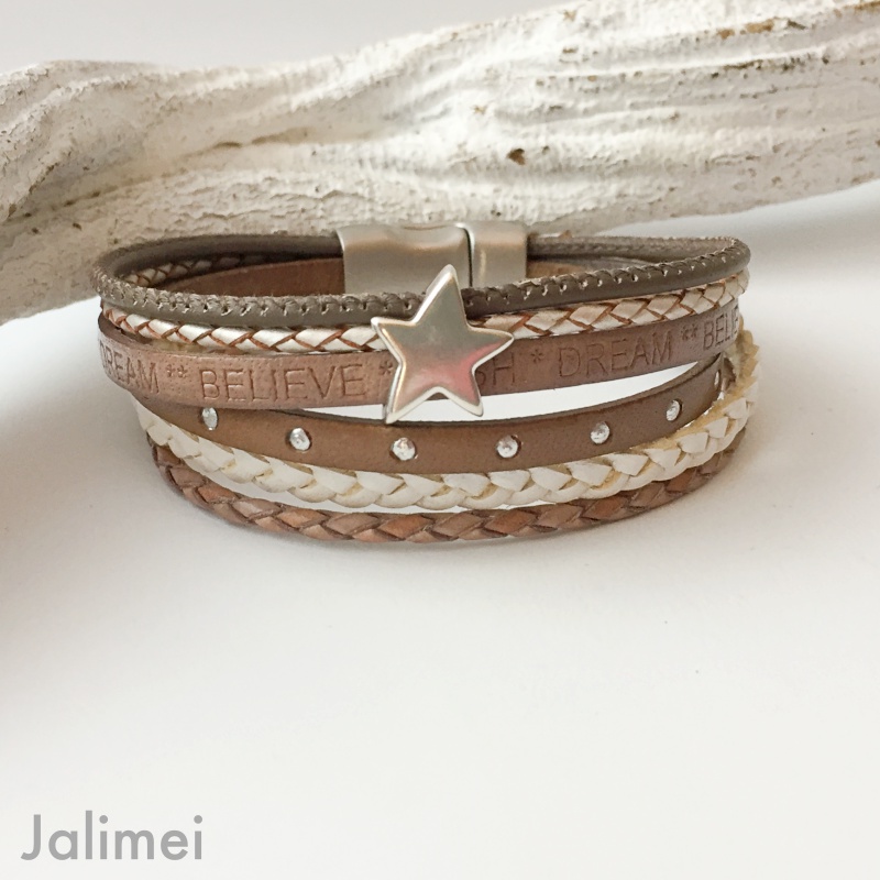 Schönes Armband bestehend aus 6 verschiedenen Lederbändern in den Farben taupe und weiß. Aufgepeppt ist es mit einem Metallschieber Stern und wird mit einem hochwertigen Edelstahl- Magnetverschluß geschlossen.