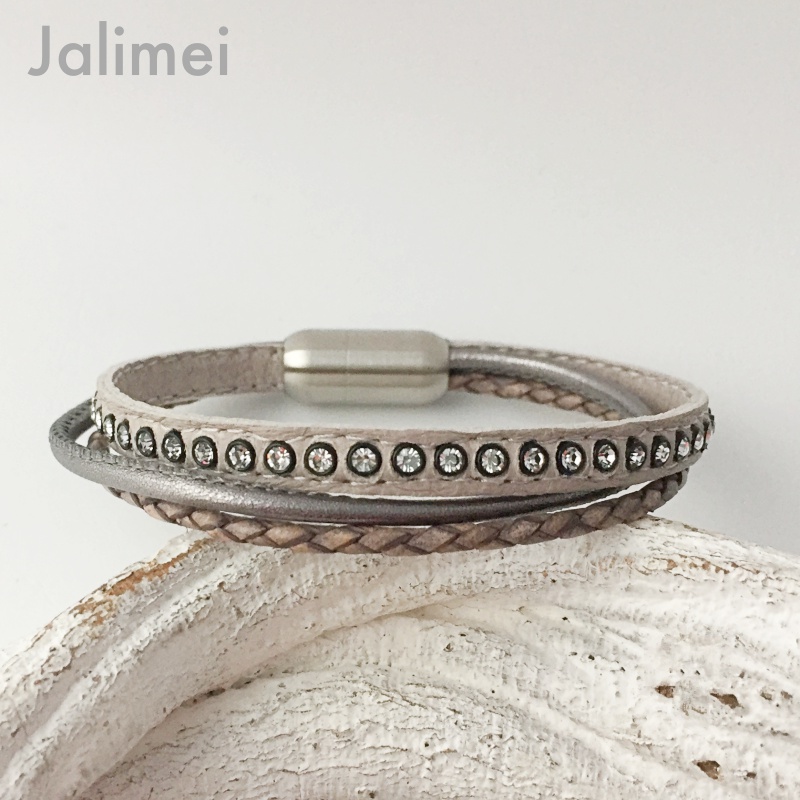 Schönes schlichtes Armband bestehend aus 3 Lederbändern: ein hellgraues Nappalederband besetzt mit Strasssteinchen (ca. 6 mm), einem Nappalederband in darksilver (ca. 2,5 mm) und einem antikgrauen geflochtenen Lederband (2,5 mm).