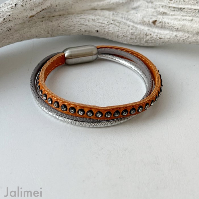 In dem Armband sind verschiedene Bänder verarbeitet: ein mit Strasssteinchen besetztes Nappalederband (ca. 6 mm) in einem schönen orange sowie zwei Nappalederbänder (ca. 2,5 mm) in hellgrau und silber.