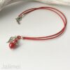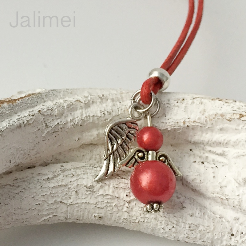 Lederbandkette mit einem Engelchenanhänger und einem Engelsflügel in einem hellen Rot Die verwendeten Miracle Bead Perlen schimmern besonders schön, wenn Licht darauf fällt.