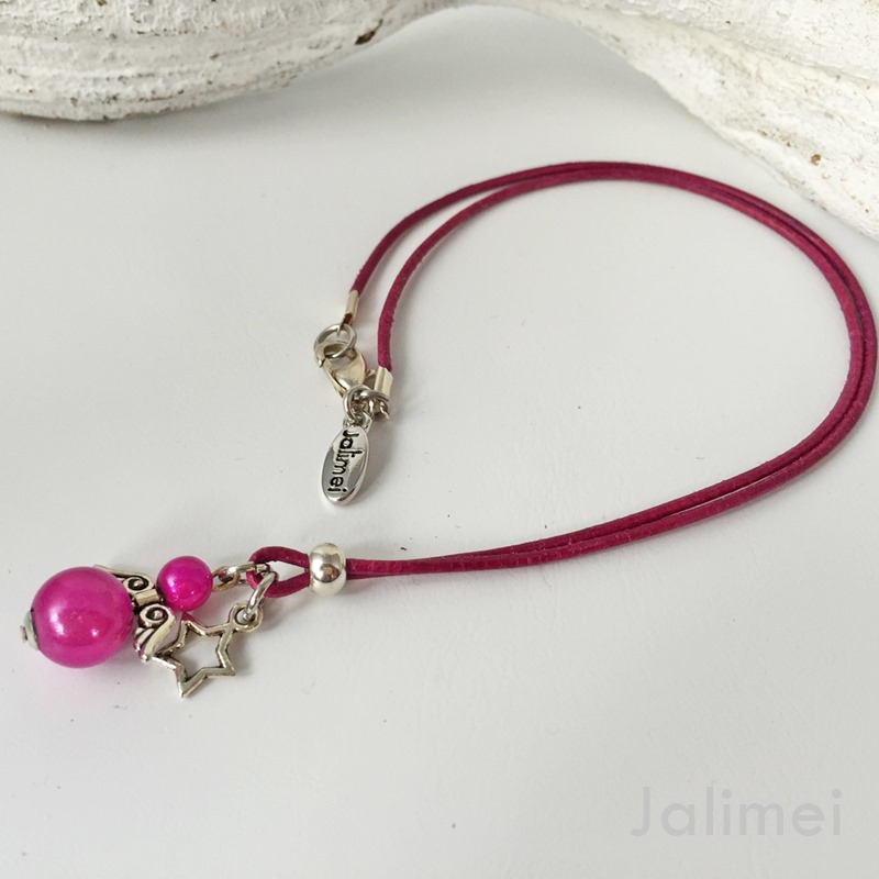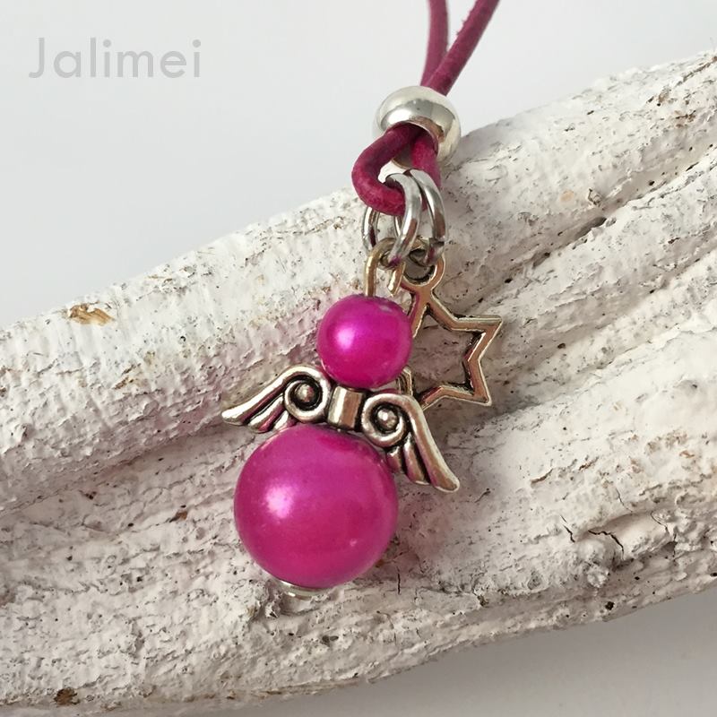 Lederbandkette mit einem Engelchenanhänger und einem Engelsflügel in der Farbe pink. Die verwendeten Miracle Bead Perlen schimmern besonders schön, wenn Licht darauf fällt.