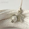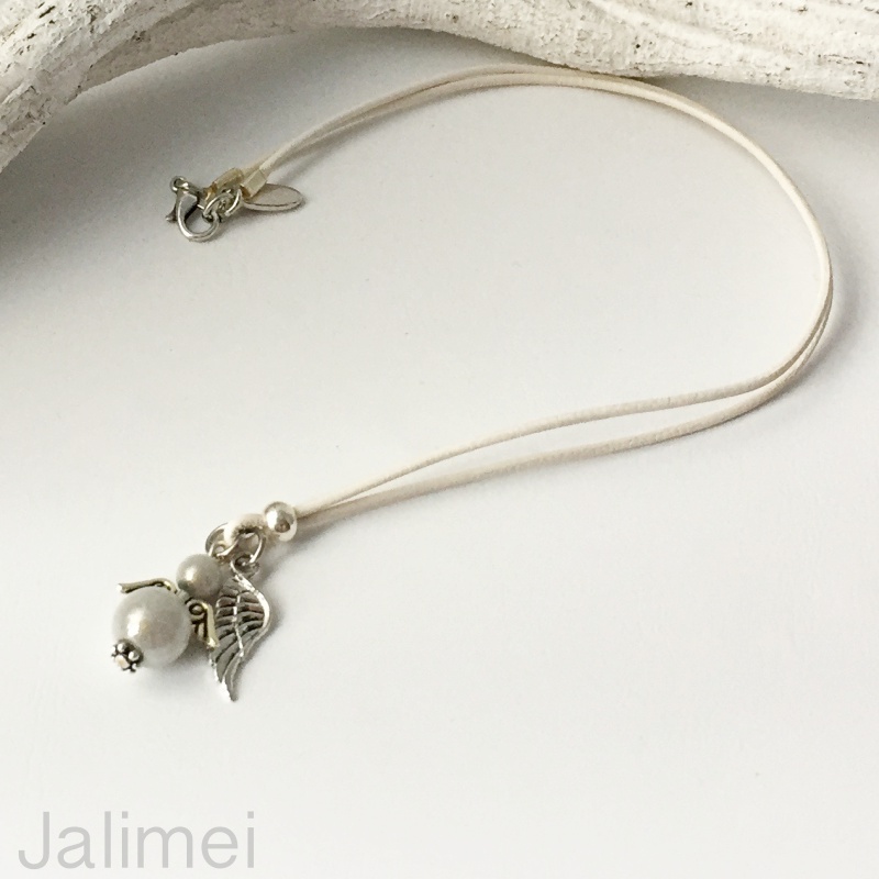 Lederbandkette mit einem Engelchenanhänger und einem Engelsflügel in der Farbe weiß. Die verwendeten Miracle Bead Perlen schimmern besonders schön, wenn Licht darauf fällt.