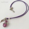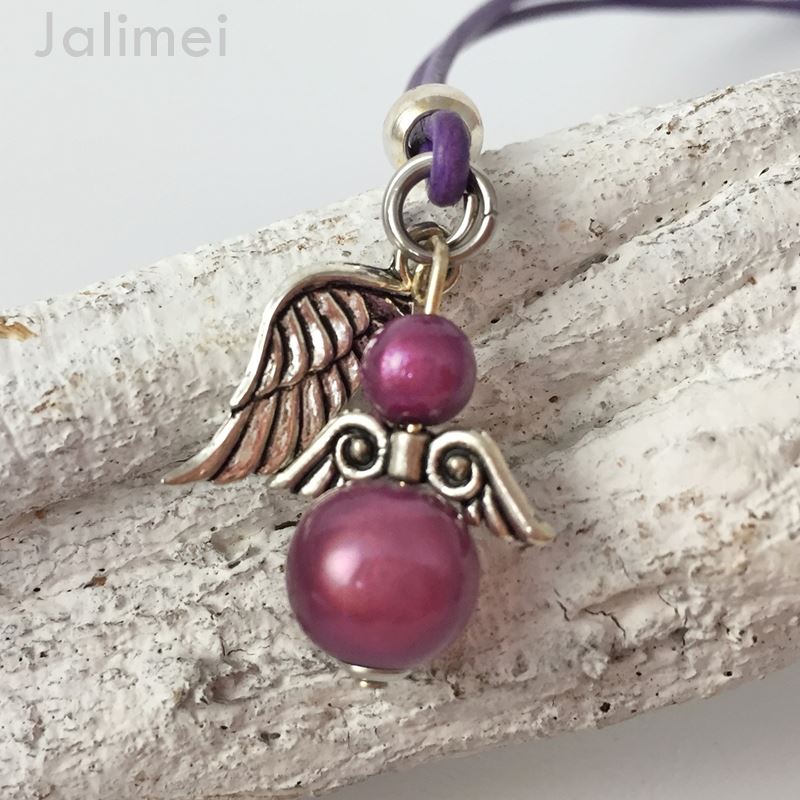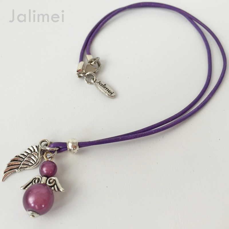 Lederbandkette mit einem Engelchenanhänger und einem Engelsflügel in der Farbe lila. Die verwendeten Miracle Bead Perlen schimmern besonders schön, wenn Licht darauf fällt.