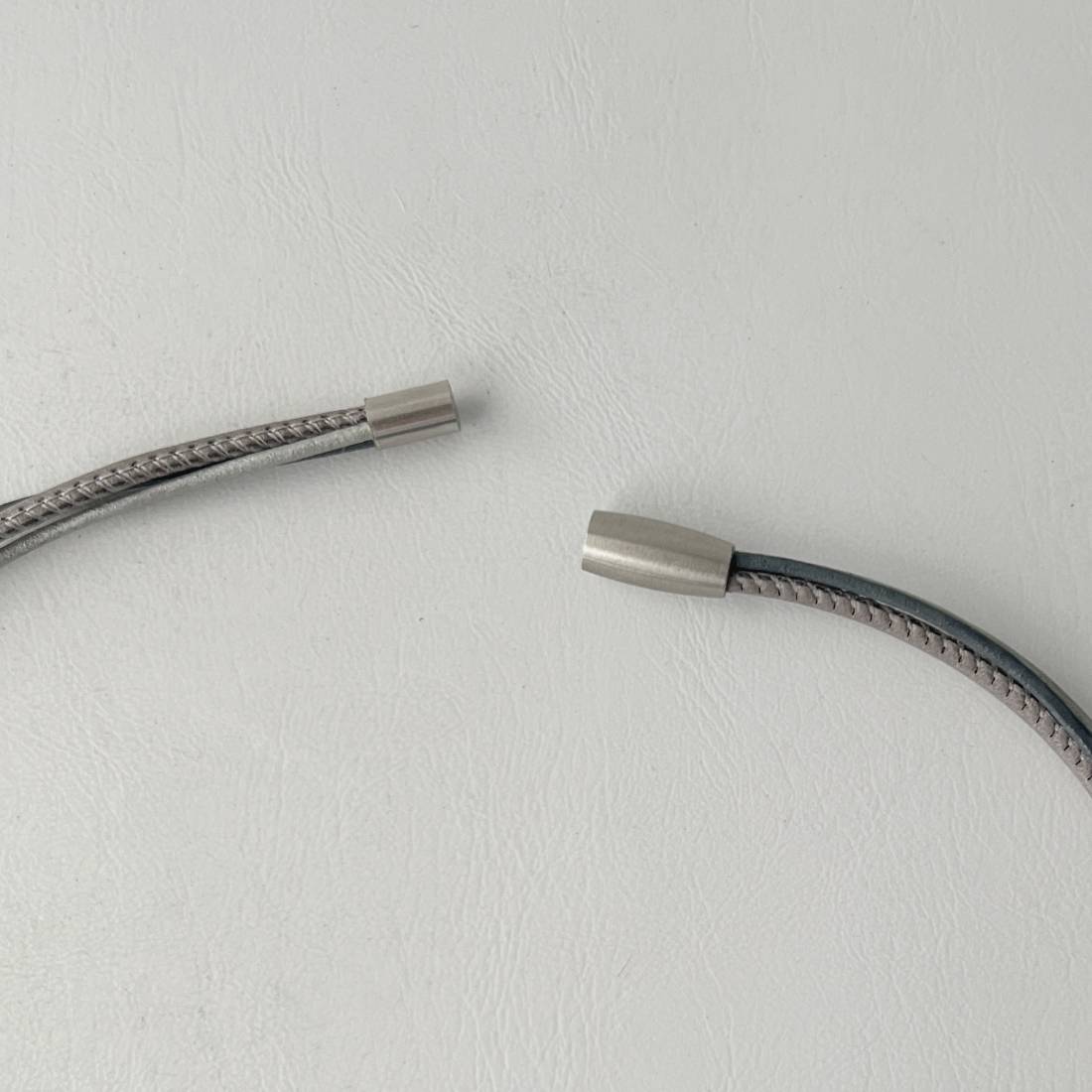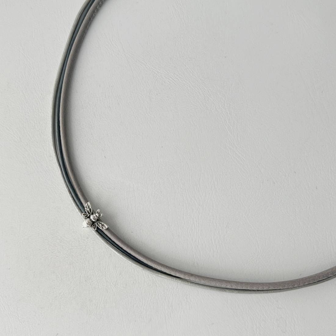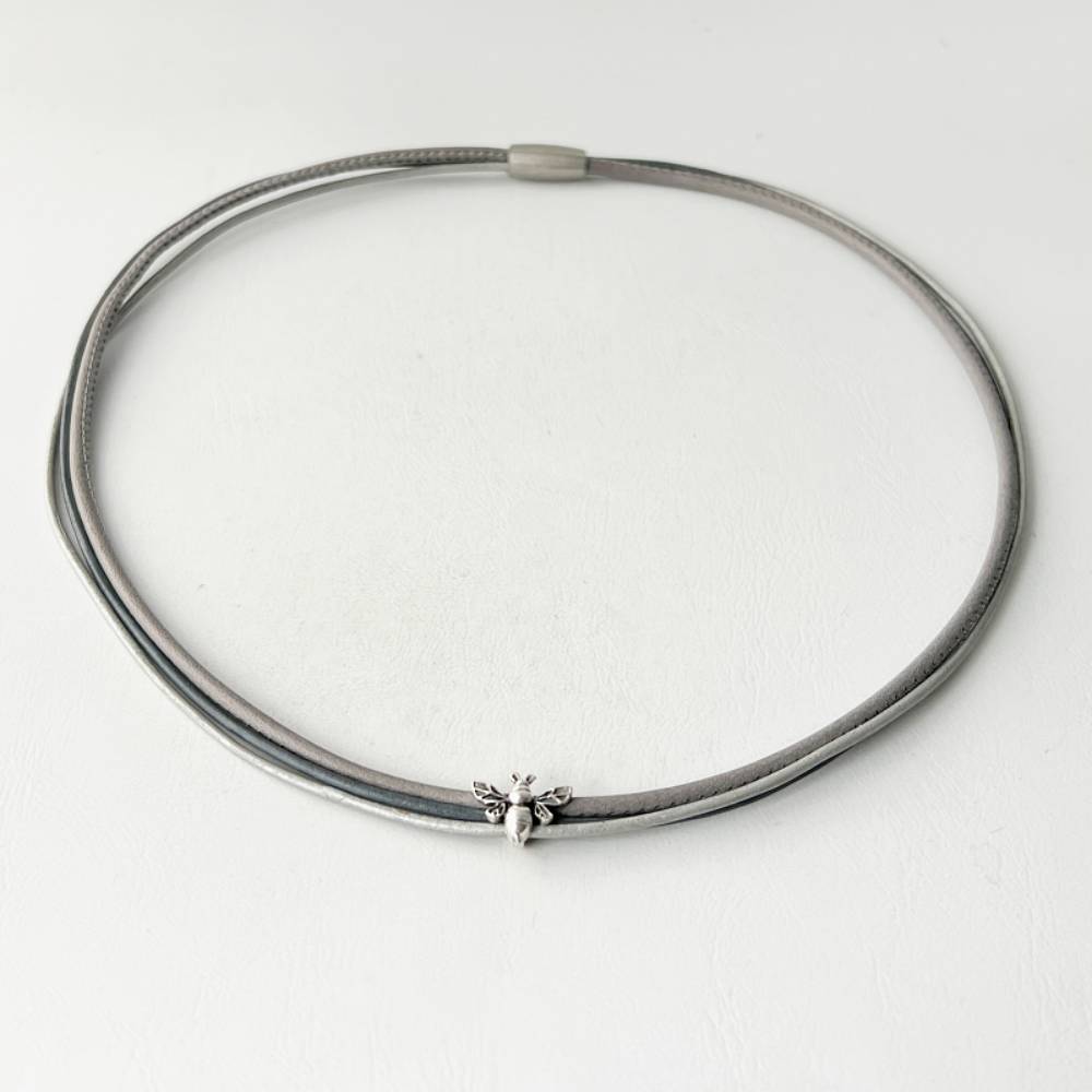Verarbeitet ist ein hellgraues Nappalederband (ca. 2,5 mm) sowie zwei feine Lederbändchen (je ca. 1,5 mm) in Grautönen. Die kleine Biene hält die Bänder zusammen.