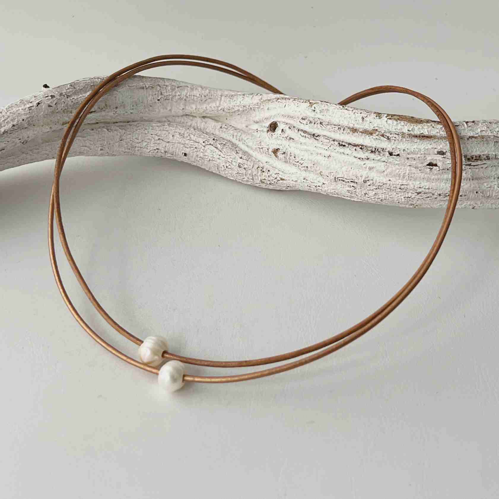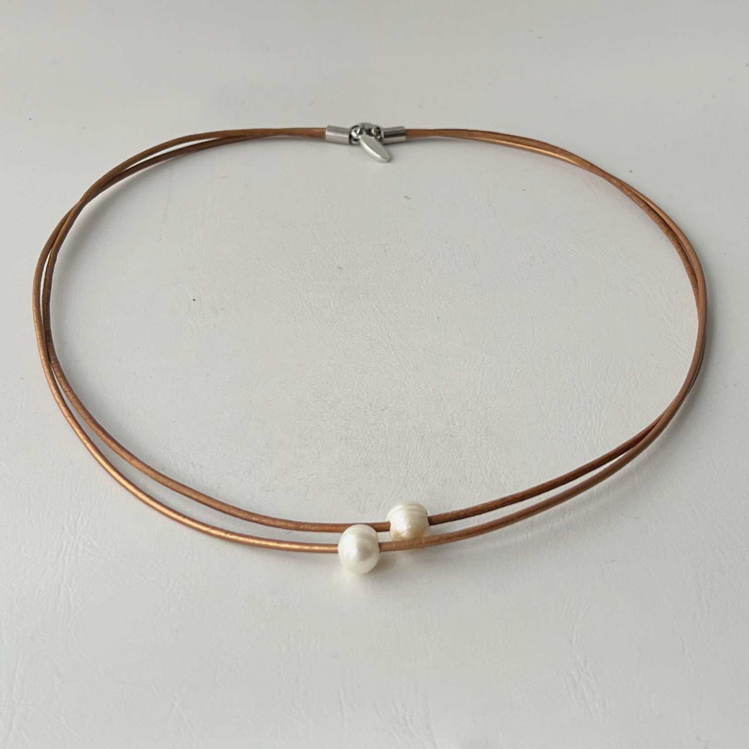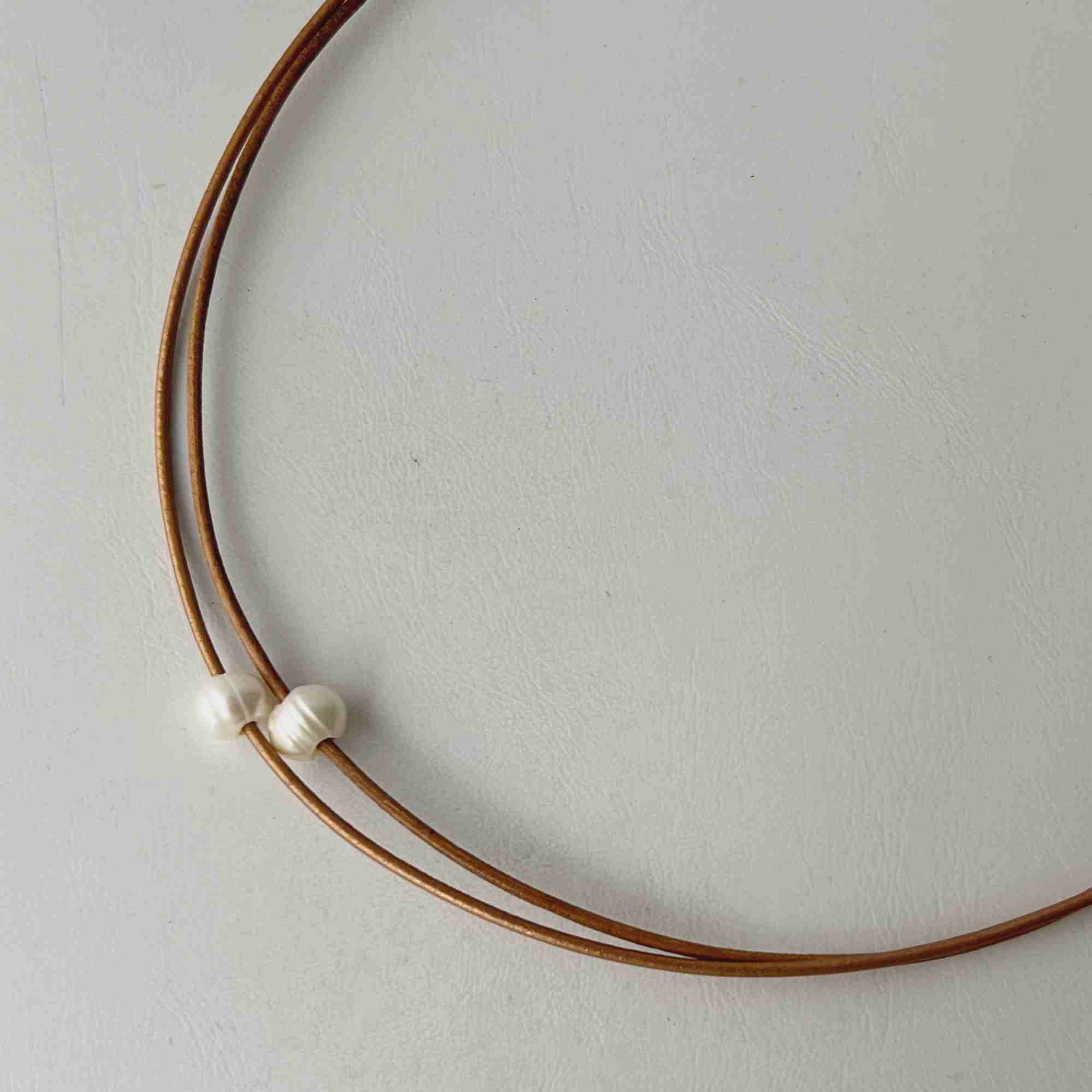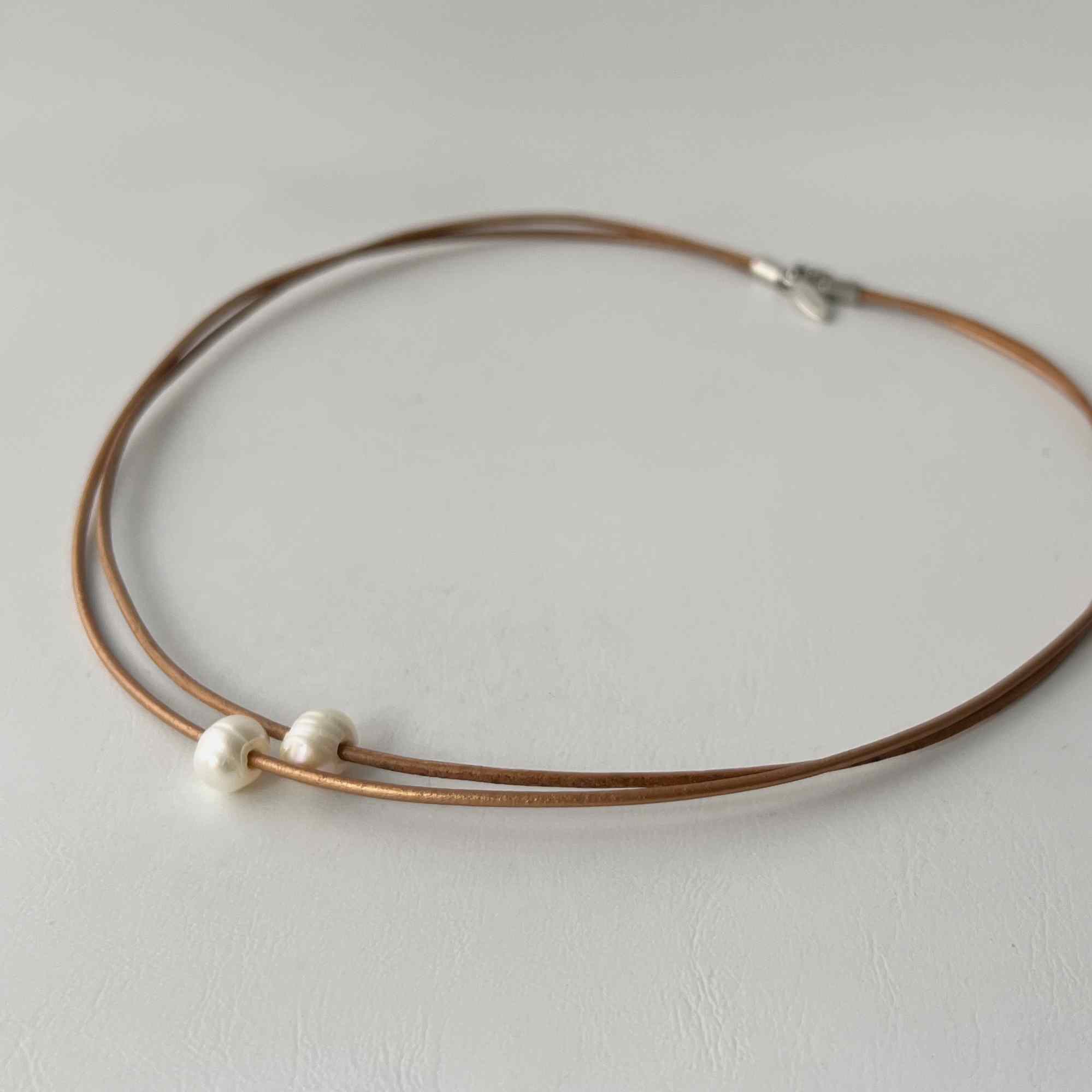 Es besteht aus zwei ca. 1,5 mm dicken Lederbändern, auf die jeweils eine Perle (ca. 7 mm, Form kann etwas variieren) gezogen ist. Am Ende sind die Bänder in den Verschlusskappen zusammengefasst. Die Bänder liegen etwas versetzt am Hals.