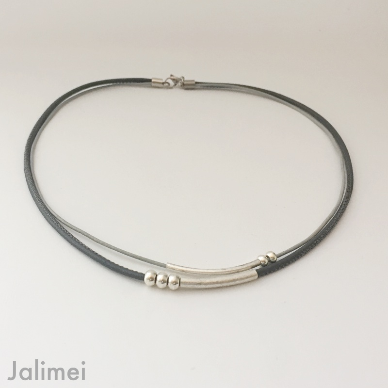 Schönes Ledercollier bestehend aus einem Nappalederband und einem 1,5 mm starken Lederband. Auf die Bänder sind Röhrchen und versilberte Perlchen gezogen, die auf den Bändern beweglich sind. Geschlossen wird das Collier mit einem Edelstahlkarabiner. Die Länge des kürzesten Bandes beträgt ca. 45 cm.