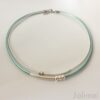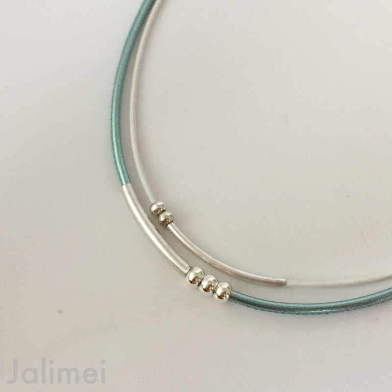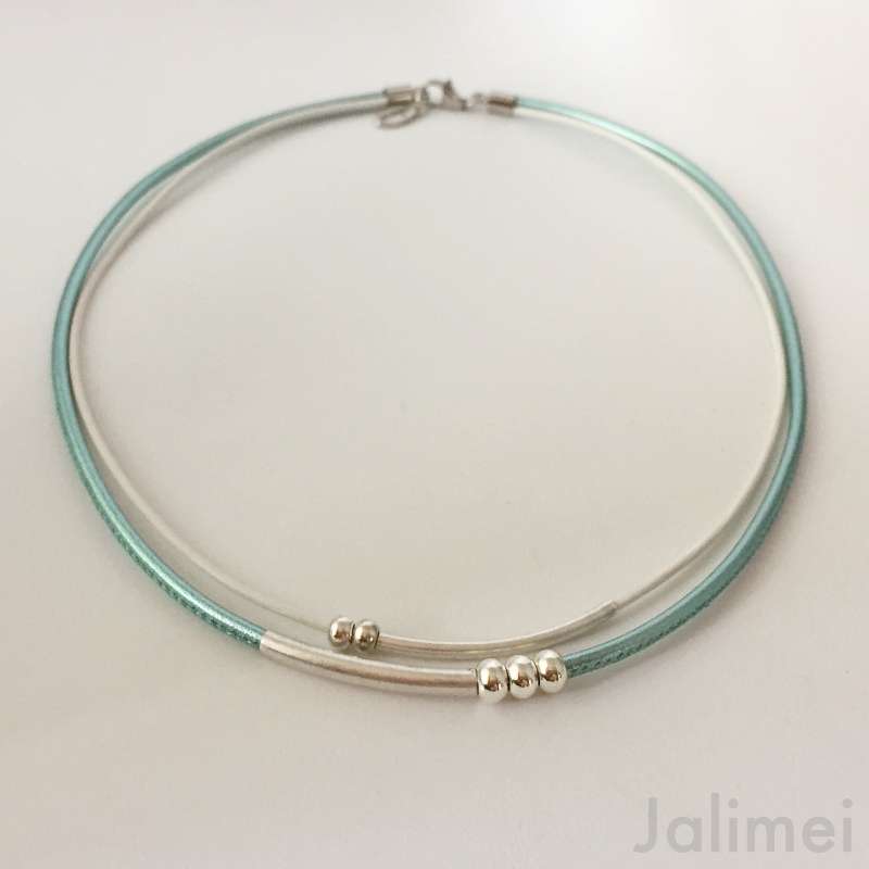 Schönes Ledercollier bestehend aus einem Nappalederband und einem 1,5 mm starken Lederband. Auf die Bänder sind Röhrchen und Silberperlchen gezogen, die auf den Bändern beweglich sind. Geschlossen wird das Collier mit einem Edelstahlkarabiner. Die Länge des kürzesten Bandes beträgt ca. 45 cm.