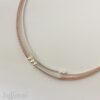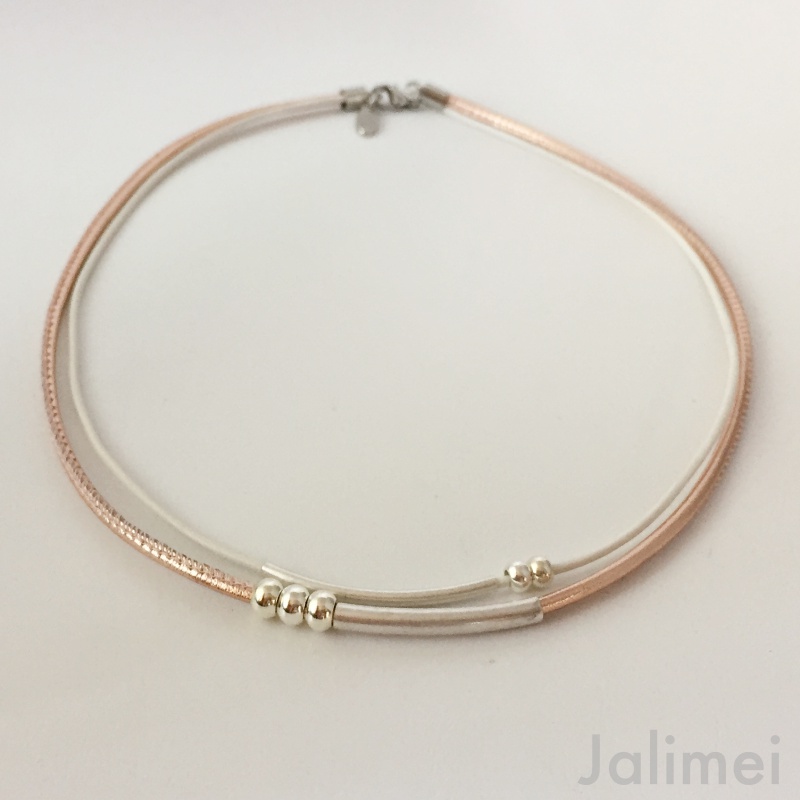 Schönes Ledercollier bestehend aus einem Nappalederband und einem 1,5 mm starken Lederband. Auf die Bänder sind Röhrchen und Silberperlchen gezogen, die auf den Bändern beweglich sind. Geschlossen wird das Collier mit einem Edelstahlkarabiner. Die Länge des kürzesten Bandes beträgt ca. 45 cm.