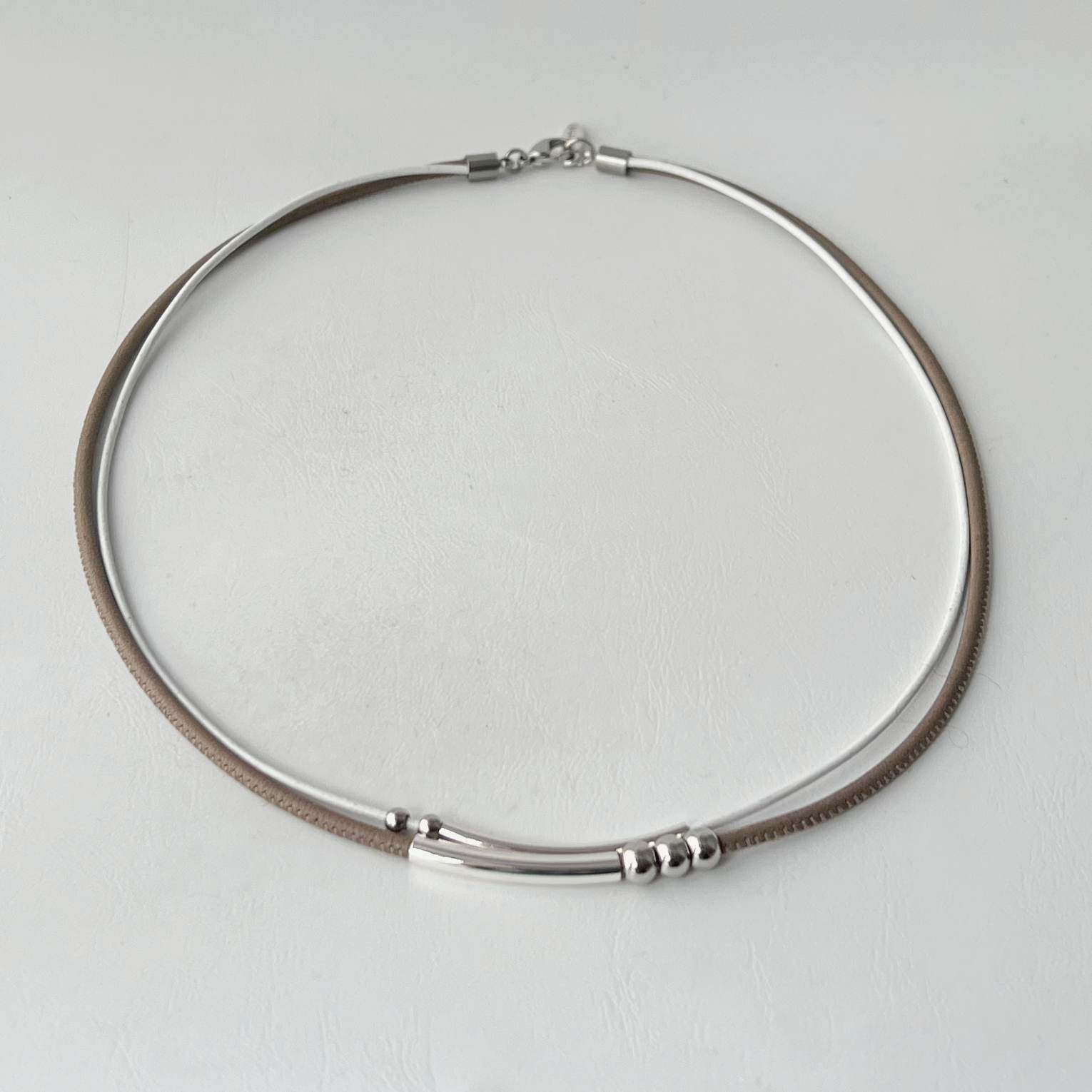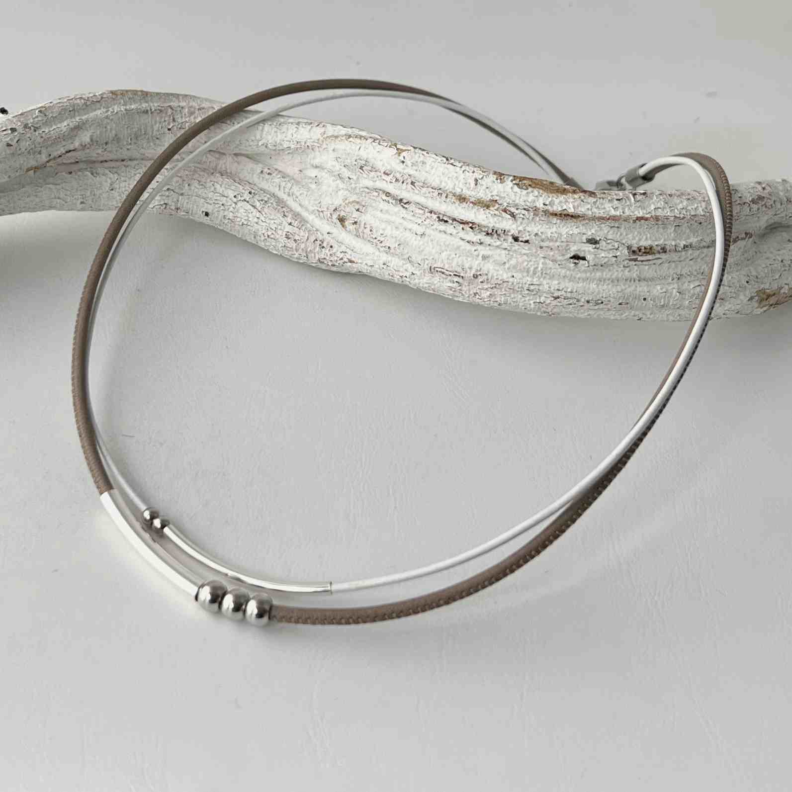Das leichte Ledercollier Röhrchen und Perle taupe wird Dein Schmuckrepertoire super ergänzen!