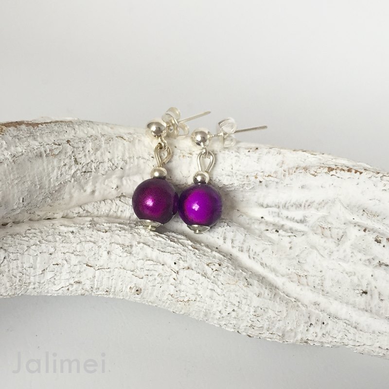 Ein Paar Ohrstecker mit einer hängenden Miracle Bead Perle in dunklem Lila in einer Stärke von 8mm.